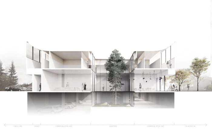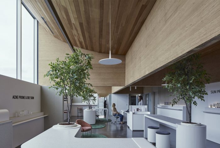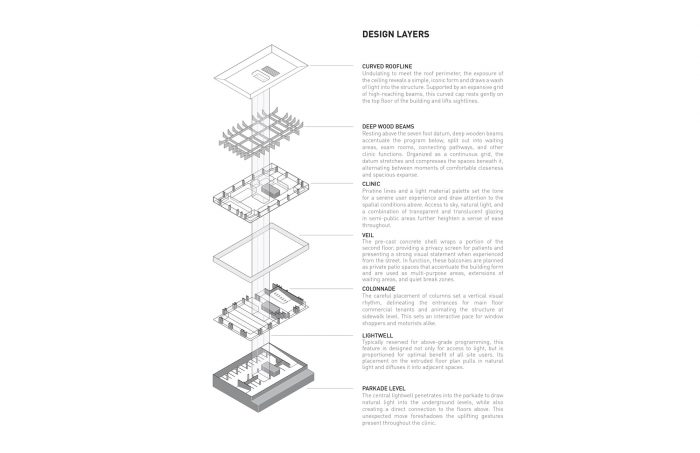 Beacon is a health-oriented commercial building that centers around a purpose-designed skin clinic. The building features three clinics [medical dermatology, aesthetic, and rheumatology] at the second story level, retail units at grade, on top of underground parking. Selected for its more robust qualities, concrete is used for the building base [underground and above ground], while wood is used as a primary inspiration to create a warm and welcoming space.