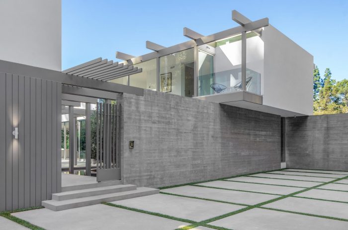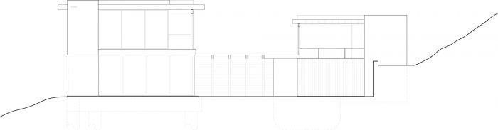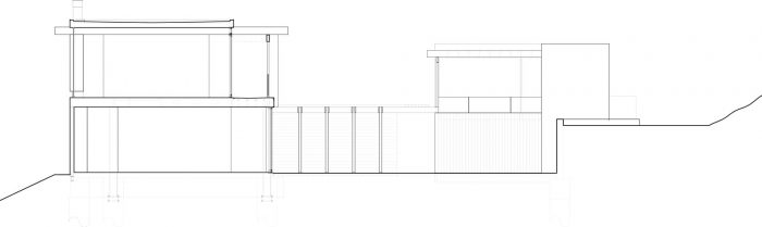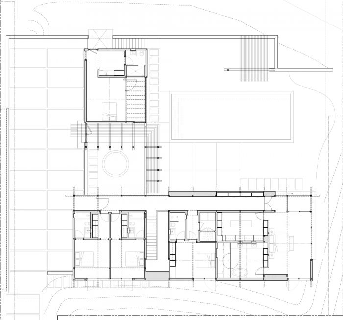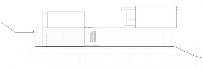 The design solution we introduced was a roofed beam system, which has a major upper roof attached to the top of the beams, while the secondary lower roof system is attached to the bottom of the beams. The residual space between the upper and lower roofs became clearstory windows which bring sunlight into the spaces at the core of the building. While large glazing elements at the opposite side of the living spaces frame the canyon views. The structural rhythm of the exposed beams is reminiscent of California midcentury modern architecture. We chose to embrace the resulting midcentury notion and develop a contemporary variation of a midcentury home. The procession to this home begins at the long driveway leading up to a motor court. We introduced a hidden garage door with channel shiplap wood siding, which became the cladding material of the accessory structure on the ground floor. The long board form poured in place concrete retaining wall creates a boundary for the flat pad against the hillside. The proportions of the retaining wall boards have the same corresponding board pattern as the shiplap siding of the accessory structure. The concrete is formed horizontally while the shiplap wood siding is oriented vertically.