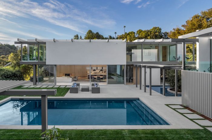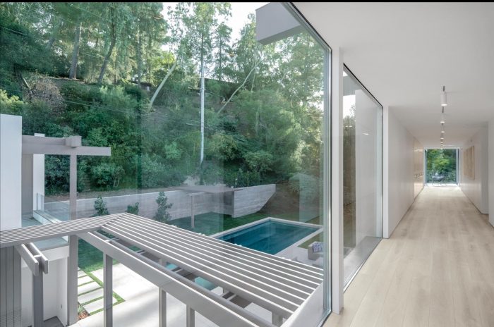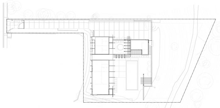 这个项目是在洛杉矶贝莱尔社区的一个旗形山坡上开发的。该地块的方向在一个峡谷内,太阳从平坦的建筑平台后面的陡峭山丘上升起。该地块的有利景观是在太阳路径的另一侧,向下坡方向的社区峡谷看。设计上的挑战是如何将建筑朝向景观,同时让阳光从相反的方向照亮建筑的核心部分。此外,当地政府有一个限制使用天窗的分区条例,禁止使用单层平屋顶,要求额外的二级平屋顶必须覆盖总屋顶面积的30%。