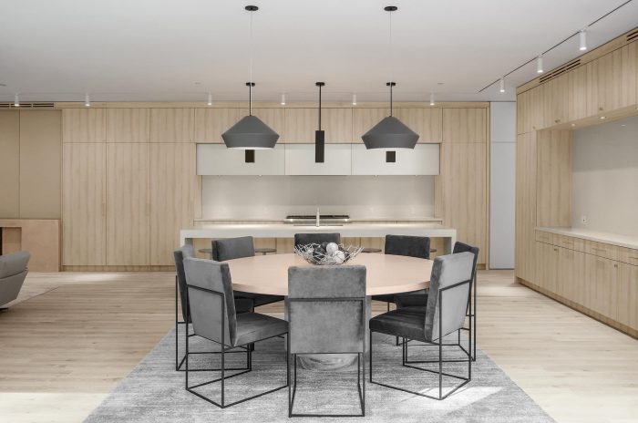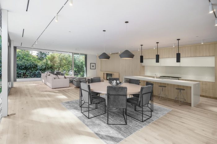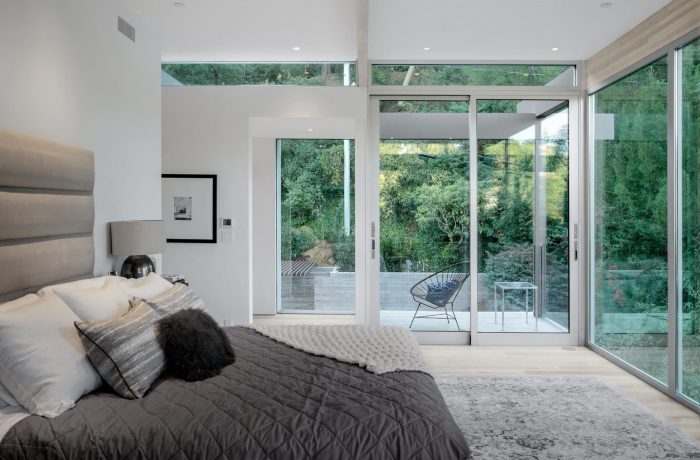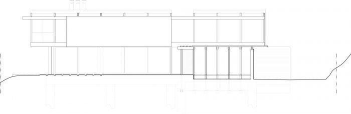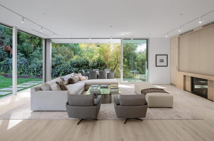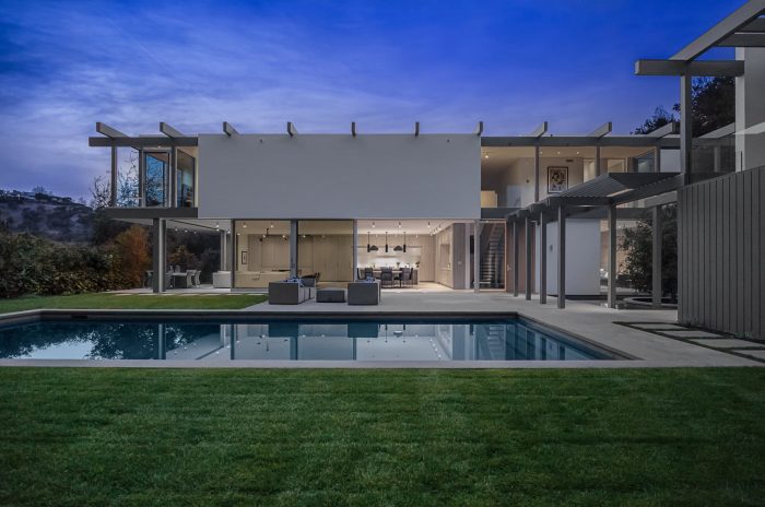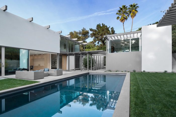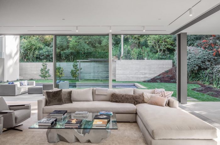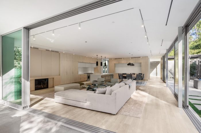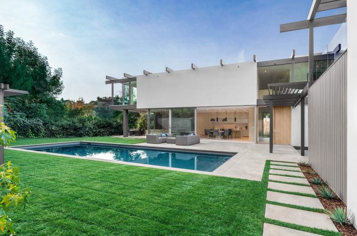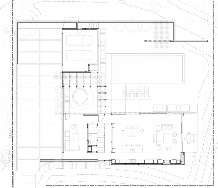Continuing from the motor court into the entry courtyard, the procession to the front door resumes with a pond on one side, with a native oak tree in the center, and the shiplap clad accessory structure on the opposite side. Past the entry courtyard, the interior ground floor opens up to the yard, with a major sliding glazing element connecting the interior and exterior spaces. This creates an expansive and privacy protected indoor / outdoor living space, which is a fundamental aspect of the regional mid-century concept and its typological character.