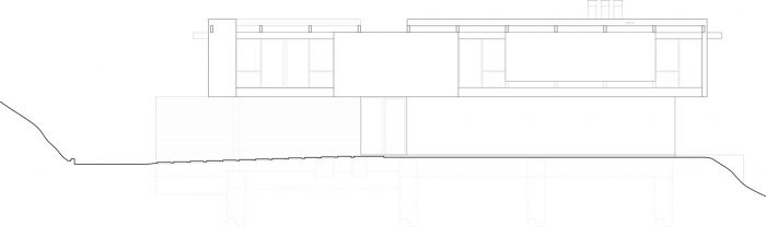 我们引入的设计方案是一个有屋顶的横梁系统,它的主要上层屋顶连接在横梁的顶部,而次要的下层屋顶系统则连接在横梁的底部。上部和下部屋顶之间的剩余空间成为透明层窗户,将阳光引入建筑核心的空间。而生活空间对面的大型玻璃元素则为峡谷景观提供了框架。暴露在外的梁柱的结构节奏让人联想到加州的中世纪现代建筑。我们选择接受由此产生的中世纪概念,并开发一个中世纪住宅的现代变体。通往这个住宅的队伍从通往汽车法庭的长长的车道开始。我们引入了一个隐藏的车库门,并采用槽形木板护墙板,这成为底层附属结构的包覆材料。长板形式的就地浇筑的混凝土挡土墙为平坦的垫子创造了一个靠山坡的边界。挡墙木板的比例与附属结构的木板模式相同。混凝土是水平形成的,而木板护墙板是垂直方向的。
