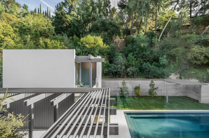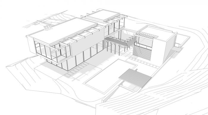 This project was developed on a flag shaped hillside lot in the Bel Air neighborhood of Los Angeles. The orientation of the site is within a canyon where the sun rises from above a steep hill behind the flat building pad. The favorable views from this lot are on the opposite side of the suns path, looking downhill towards the neighborhood canyon. The design challenge was to orient the building towards the view, while allowing sunlight to illuminate the core of the building from the opposite direction. In addition, the local municipality has an overlay zoning regulation which limits the use of skylights and prohibits single level flat roofs, requiring an additional secondary flat roof which must cover at least 30% of the total roof area.