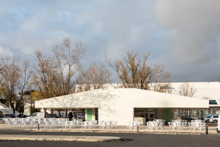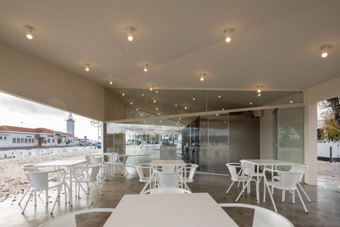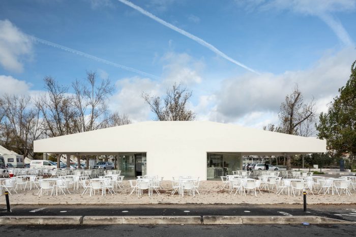 This bar/esplanade is built like a garden house with a skeleton in painted reinforced concrete, under which the areas of activity are set out.