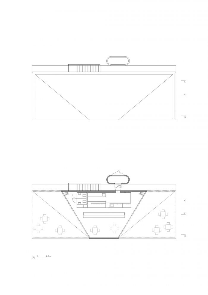 为了避免增加露台的封闭空间,该建筑包括一个仅60平方米的小封闭区域以及两个总面积为100平方米的露天广场。