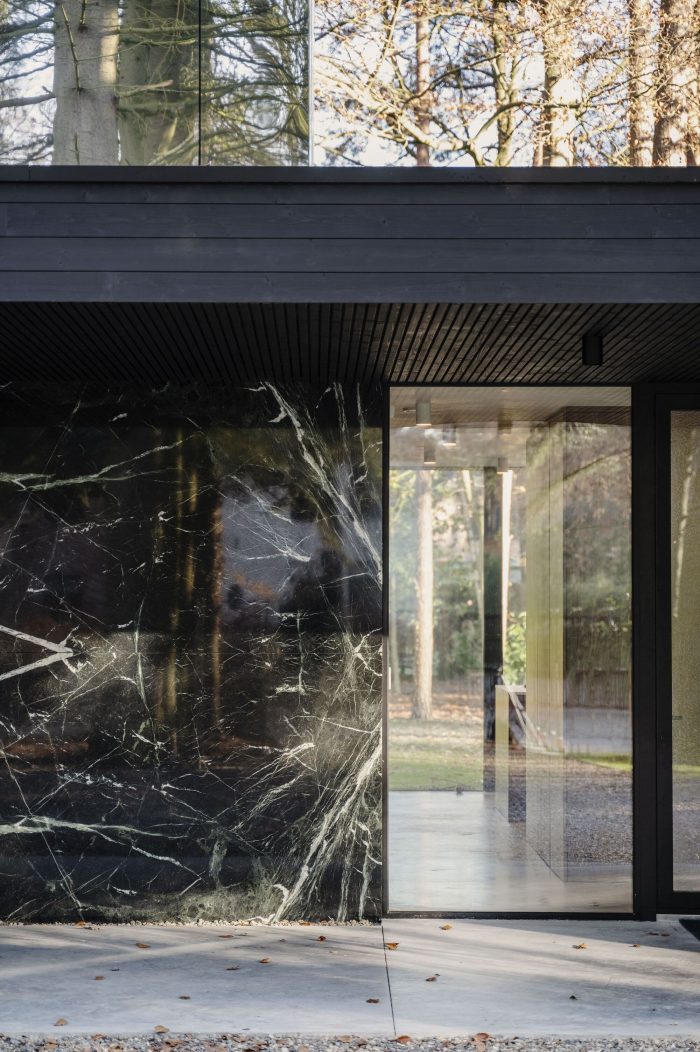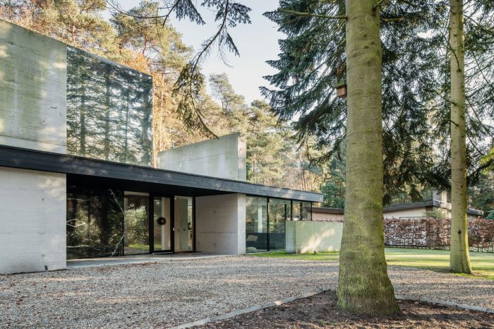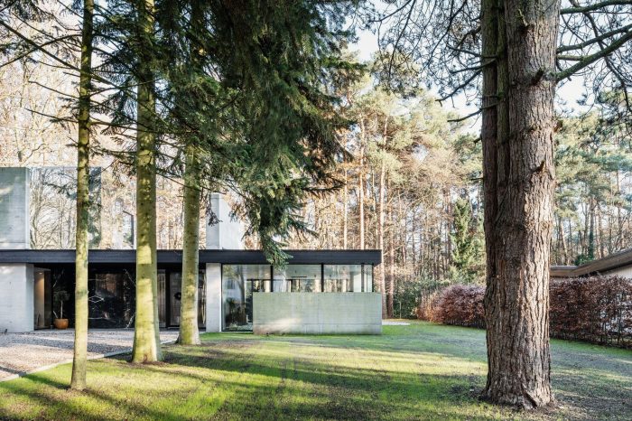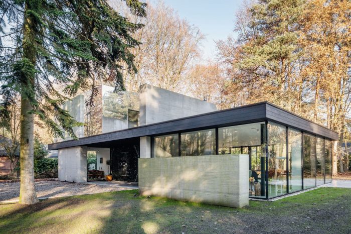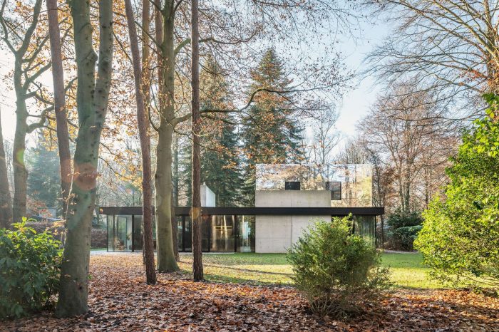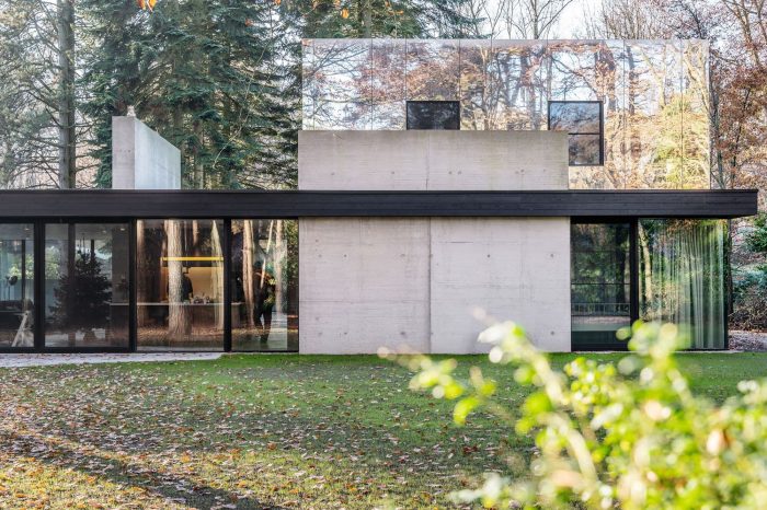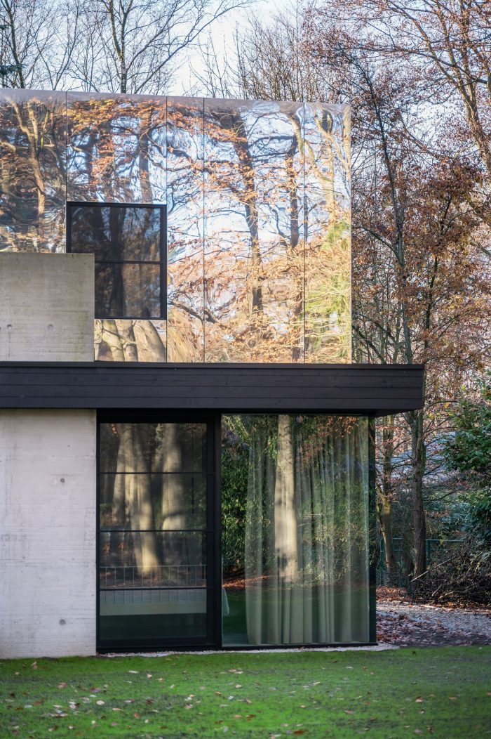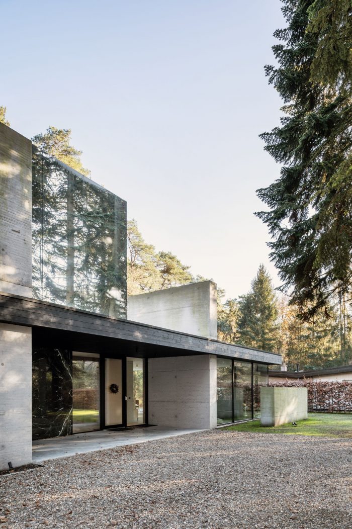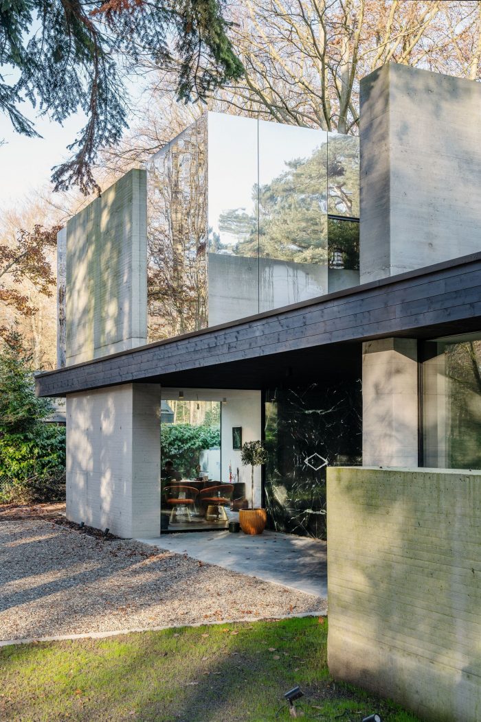 The children’s bedrooms are located on the roof, this first floor is formed by a mirrored box that disappears due to the reflection of the forest, allowing the villa to maintain its slick horizontal bungalow-like appearance. The elongation is emphasized by to the floor-to-ceiling sliding windows under the cantilevered roof, with concrete floors flowing from the interior to the exterior terraces. The visual and spacial interactions between the garden, concrete, and glass and the reflections of the mirrored volume give the building its timeless appearance and form an ode to the strength of the original design.
