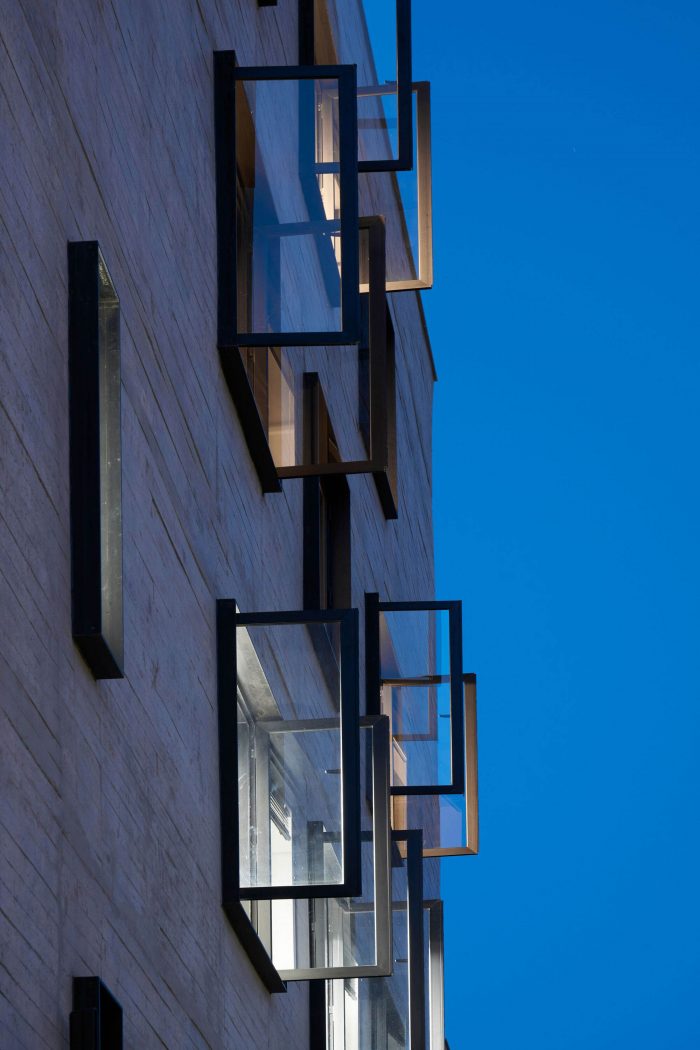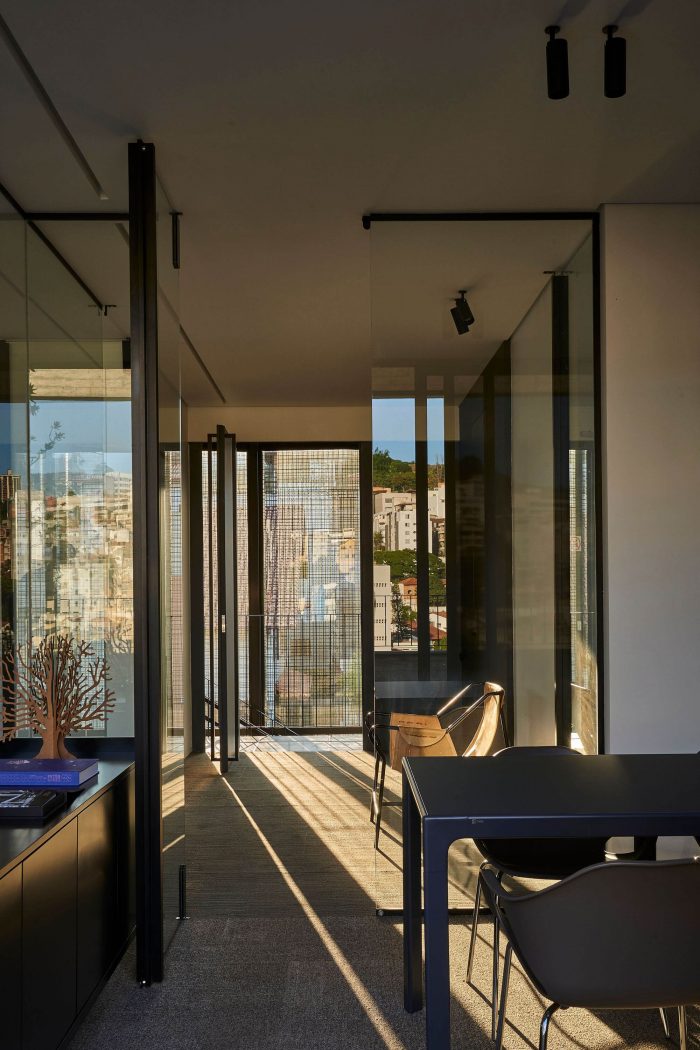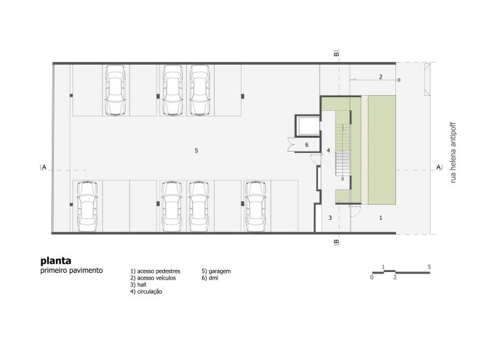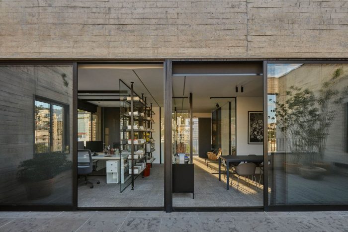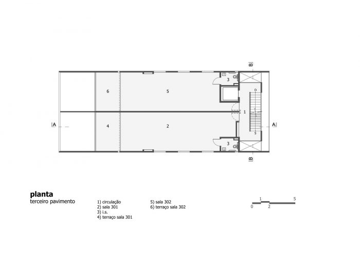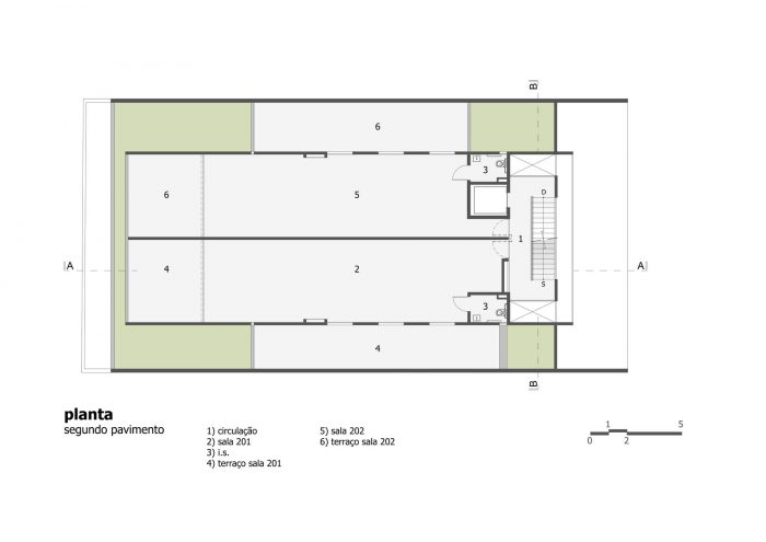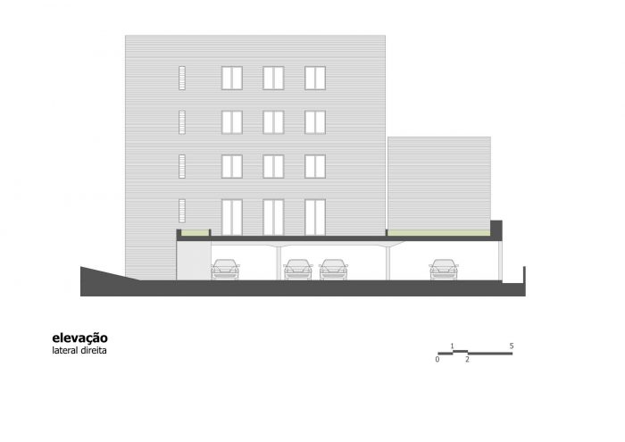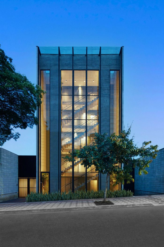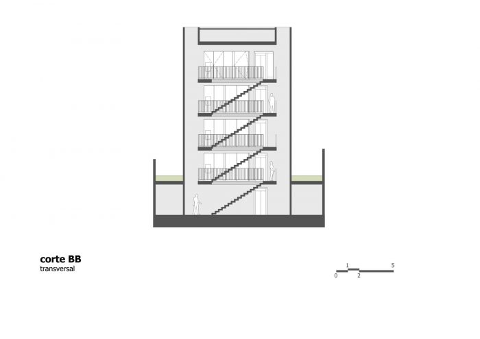 The building has five storeys, being the first one composed by the entrance hall and the garage; the second, the third and the fourth floors have two rooms each one while the fifth has only one office. The details and care with the indoor elements, like the frames, the simple drawings of the stairs and the guard rails, and the finishings on cement floor and texture, show the intention to reveal the beauty of simplicity through an honest referenced architecture.