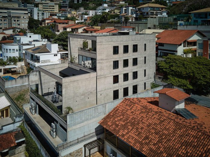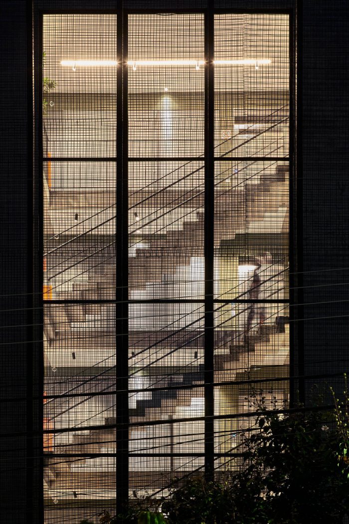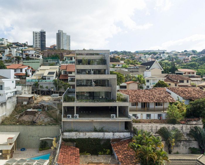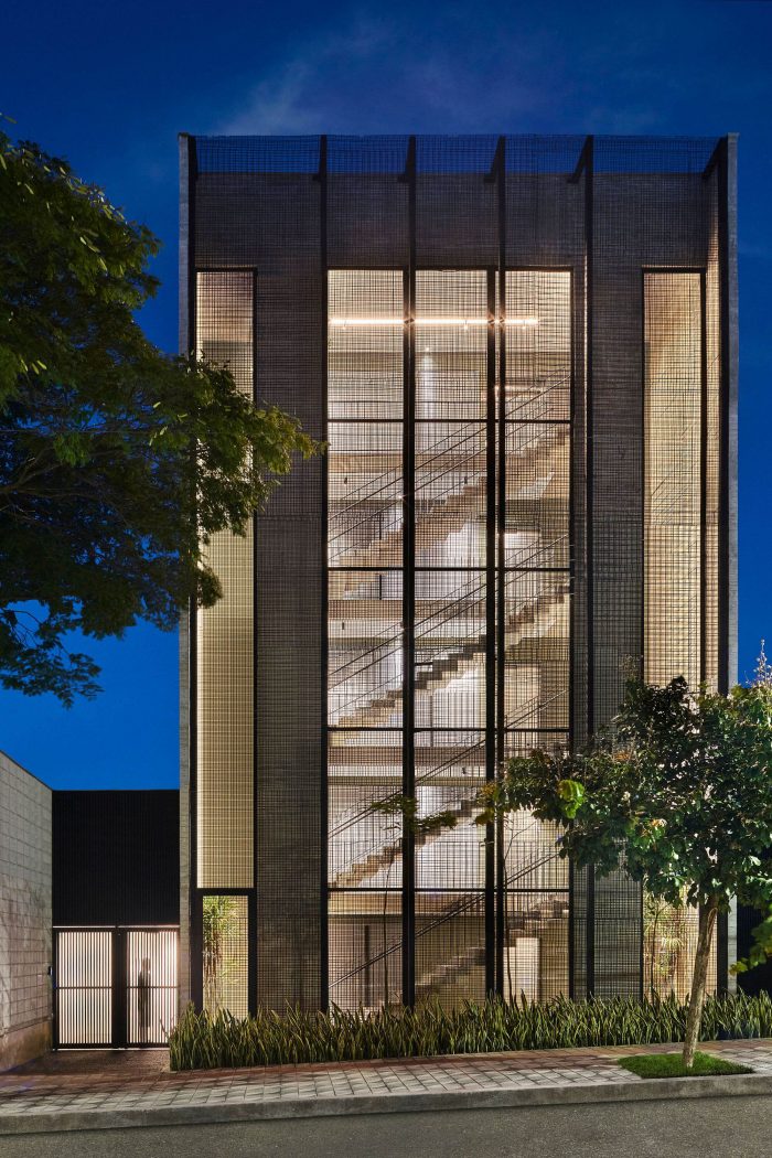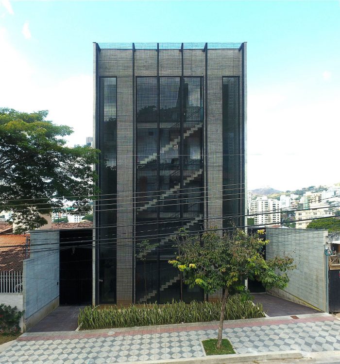 The architecture uses simple but strong lines, like both lateral walls in exposed concrete with sequenced outward projecting windows. The main façade has a big glass window protected by a rebar net, which gains more or less power depending on the observer view angle and creates a connection between the building and the street. The back façade is shaped like steps revealing the terraces of each office that not only bring quality to them but also offer a definite outstanding view of Serra do Curral, an important landmark of Belo Horizonte city.