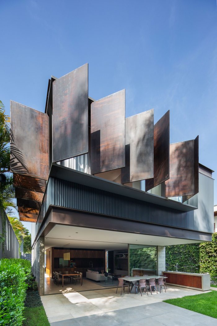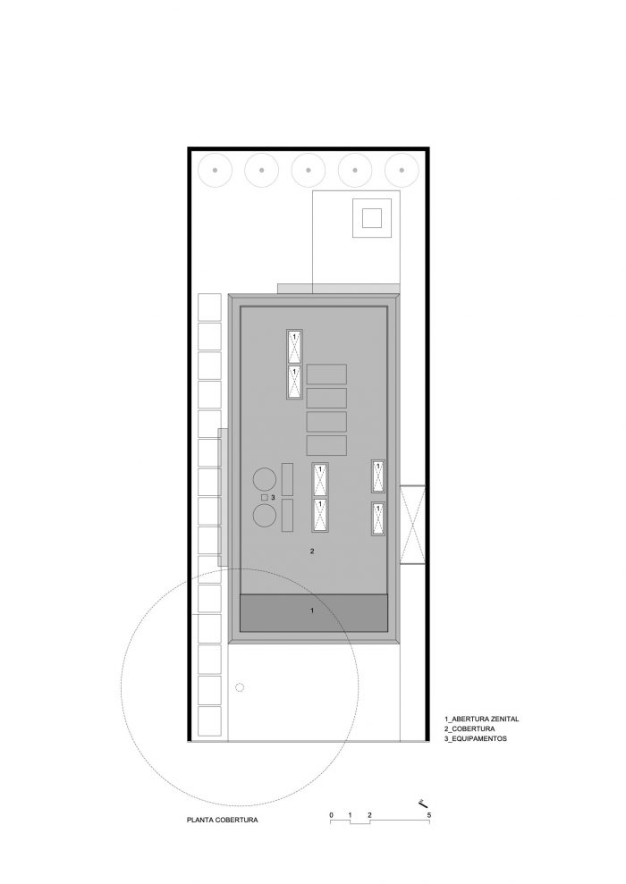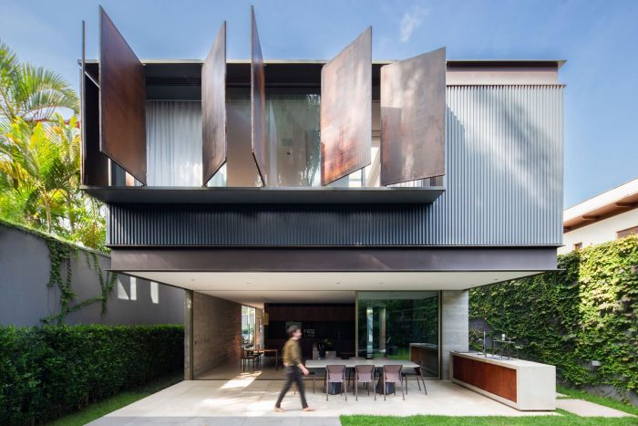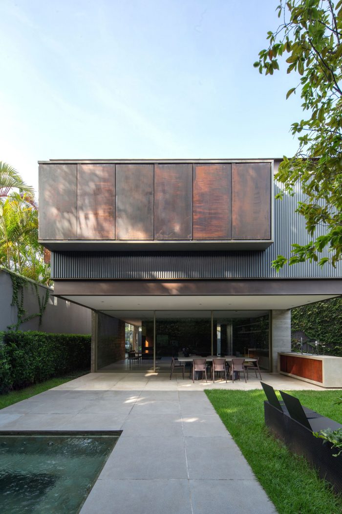 Like a metallic container placed above exposed concrete walls, this house establishes two types of relationships with the surroundings. The upper floor can be closed 100% to block sunlight, guarantee the privacy and acoustically isolate intimate spaces. But, if chosen, the facade opens at strategic points for lighting and ventilation.