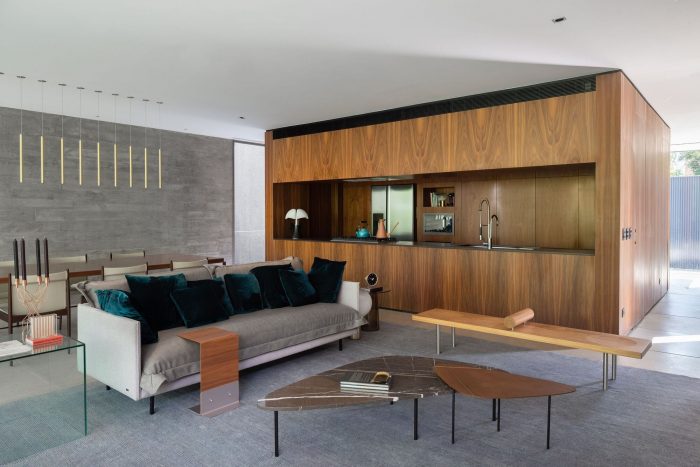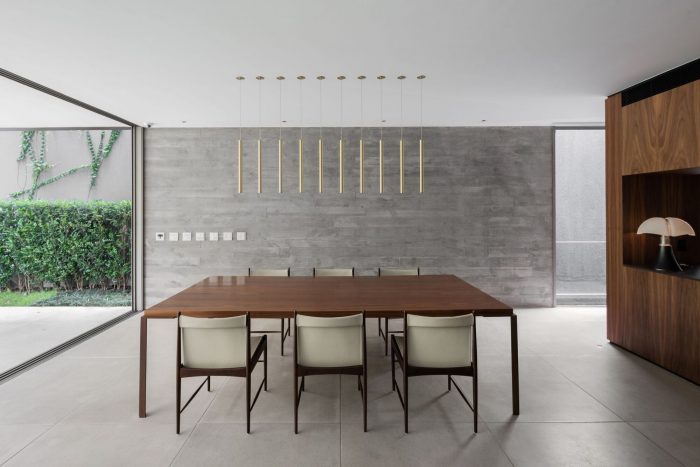 底层以相反的方式,以一种流动的方式向花园开放。内部和外部的概念被大型玻璃开口削弱了,而家具在建筑和巴西设计的作品之间建立了和谐的对话。我们设计了其中一些,如巴西利亚咖啡桌、Ensamble餐桌、Box边桌和Move长椅。