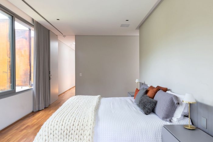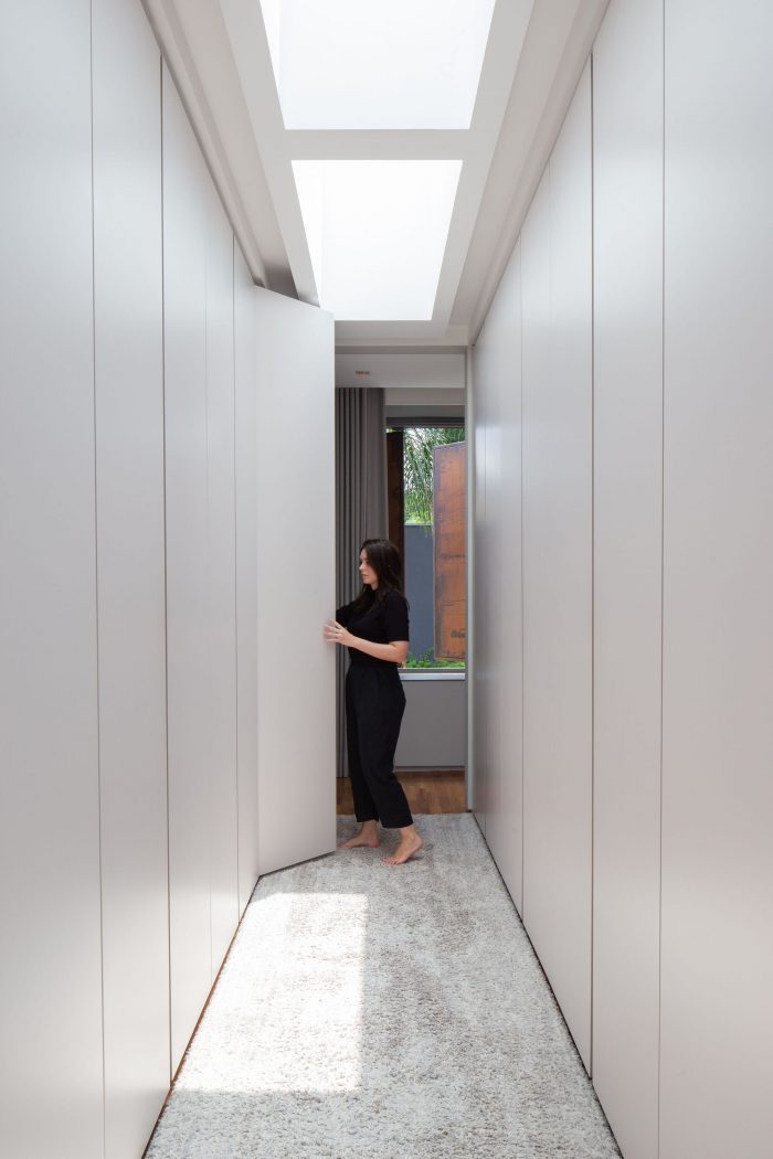 就像一个放置在裸露的混凝土墙上的金属容器,这个房子与周围环境建立了两种关系。上层楼可以100%关闭,以阻挡阳光,保证隐私,并在声学上隔离亲密的空间。但是,如果选择的话,外墙会在战略要点上打开,以获得照明和通风。
