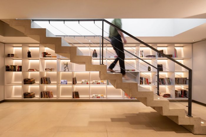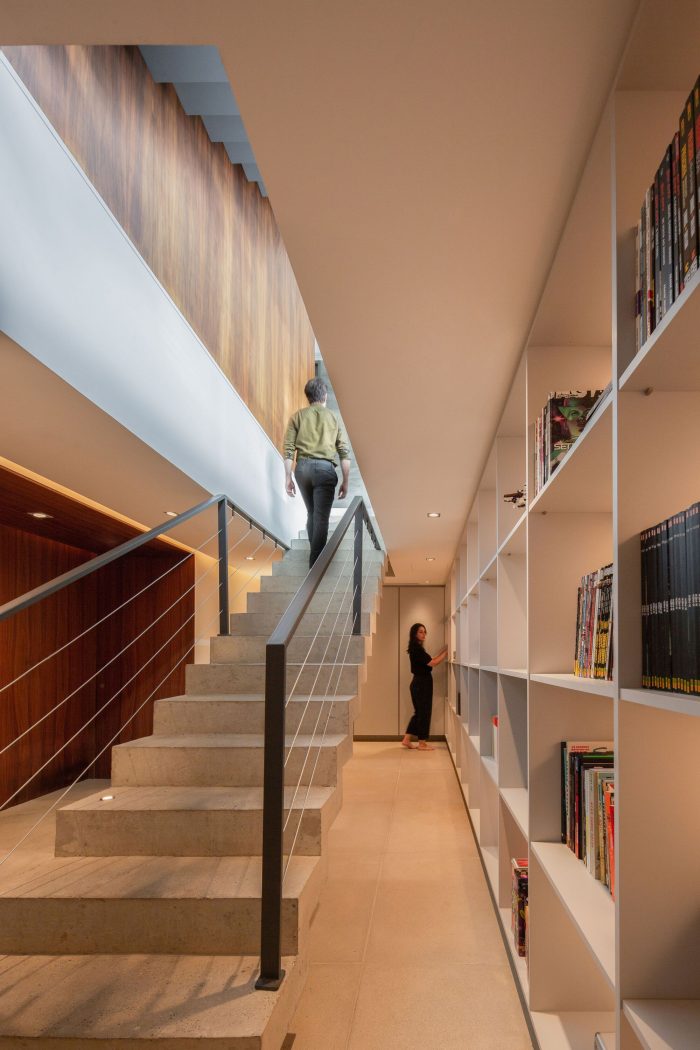 The lower floor supports the ground floor and is in the basement so as not to block the view of the perimeter gardens. The project is a contemporary urban residence for a young couple with two young daughters. So functionality is essential.