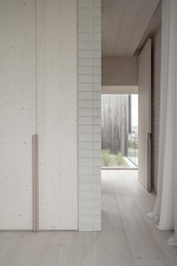 Materials selected for Bermagui House tell an evocatively nuanced story. Externally, the deliberate weathering of timber cladding and dune-like landscaping reflects its rugged context. Interiors feature a carefully curated palette of white surfaces, soft sand, timbers, and robust brickwork; an elegant minimalist iteration of rockpools, beaches, and cliffs nearby. Raw and tactile materiality, contemplative spaces, and purposeful transitions around the home can be traversed entirely barefoot. A calming counterpoint to its harsh coastal environs, and a restorative base for family getaways.