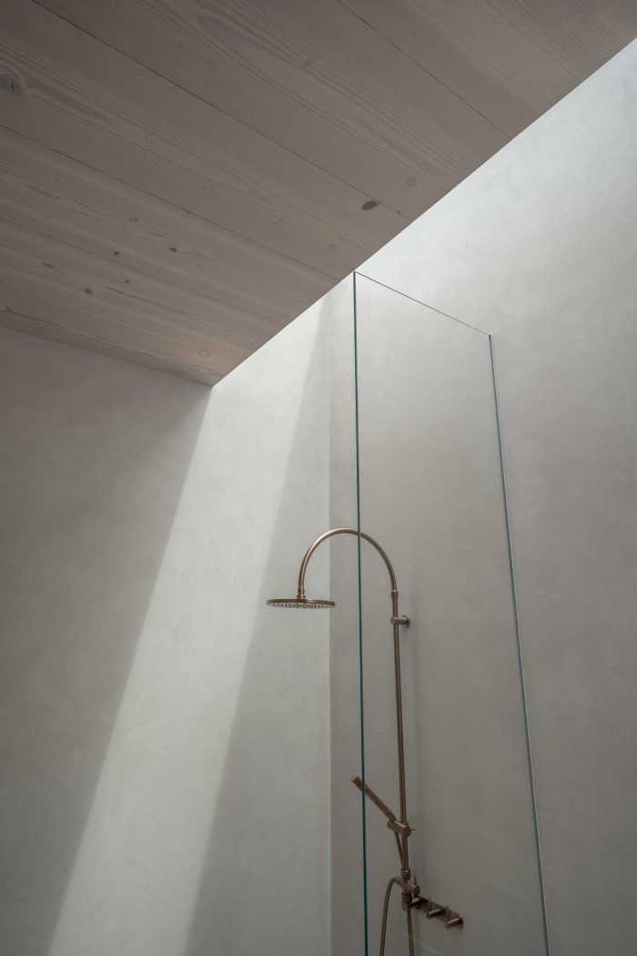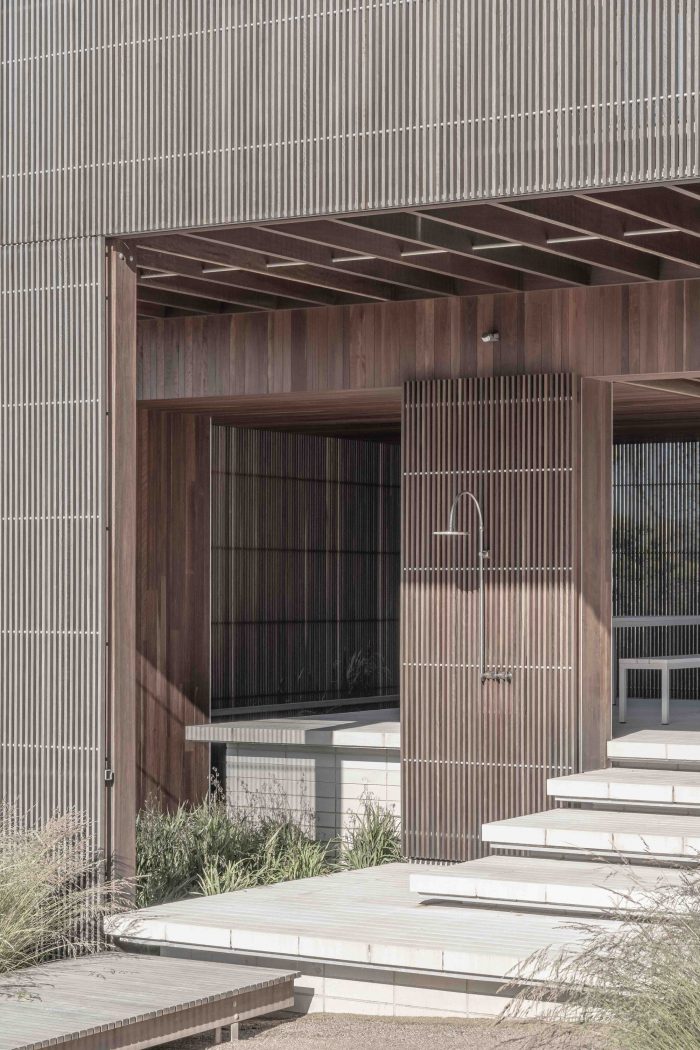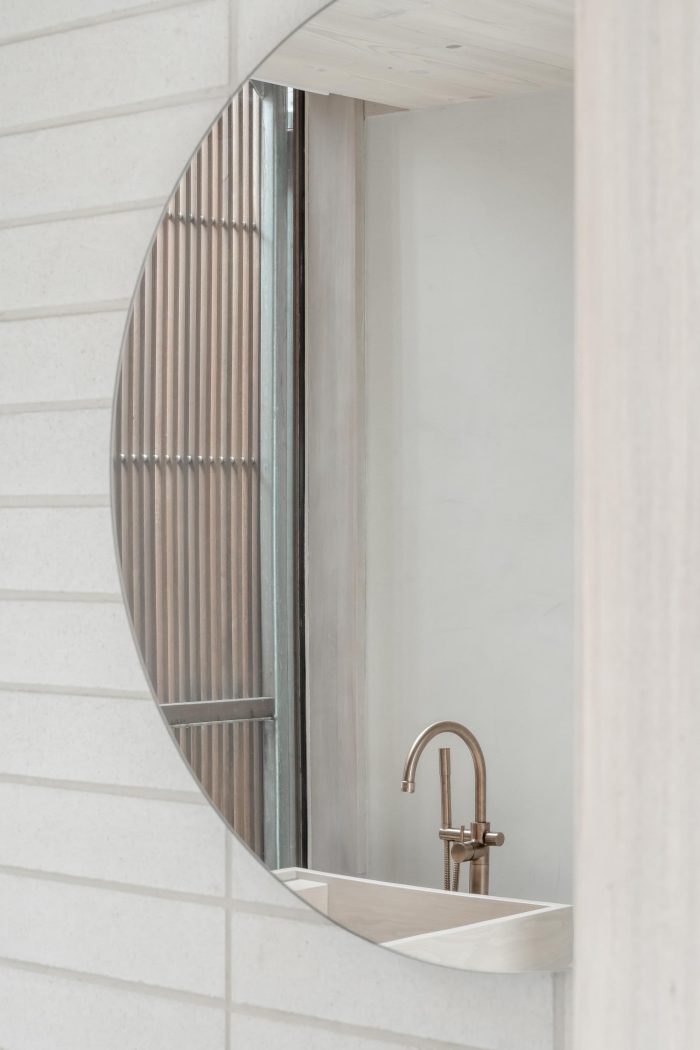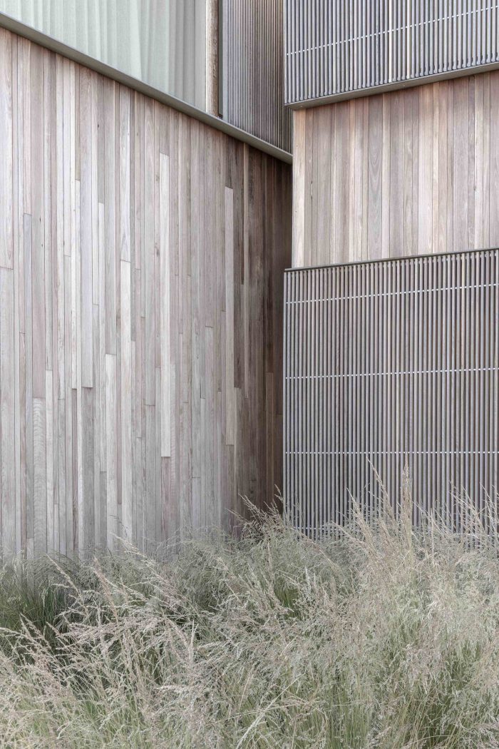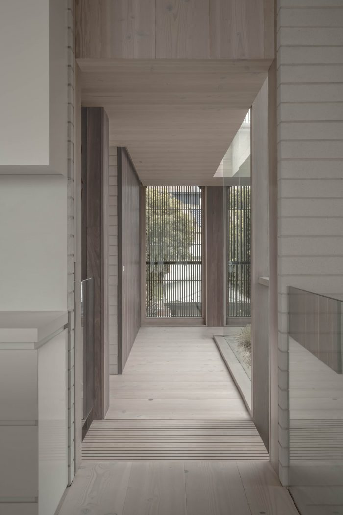 This intentional placement combines layered landscaping to create peripheral outdoor spaces, providing opportunities for sun and shelter among the pavilions. In doing so, the house and garden perform an elegant dance in step with its coastal climate, a dynamic experience for the occupant and passers-by. This relationship to the elements also informs the rhythm of openings along each façade. Though strictly ordered and proportioned, these are enlivened through shallow shifts in depth and sliding timber screens, lending a relaxed air to an otherwise formal facade.