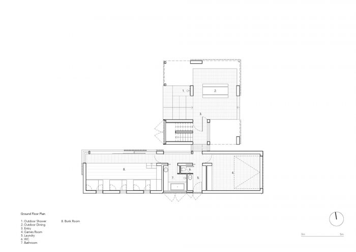 尽管对街道和社区做出了慷慨的让步,但每个亭子的位置和程序都经过深思熟虑,很好地保护了居民的隐私。生活馆位于场地的最北端,通过玻璃连接主馆和客馆,并将它们延伸到南部边界。我们的规划目标是舒适地容纳客人和主人,同时聚集和分开。楼下有盖的用餐区和客人的睡眠空间都延伸到了有遮蔽的庭院中。楼上,灵活的生活空间可以打开或缩小,独立的睡眠区为住宅的主要居住者提供临时的避难所。