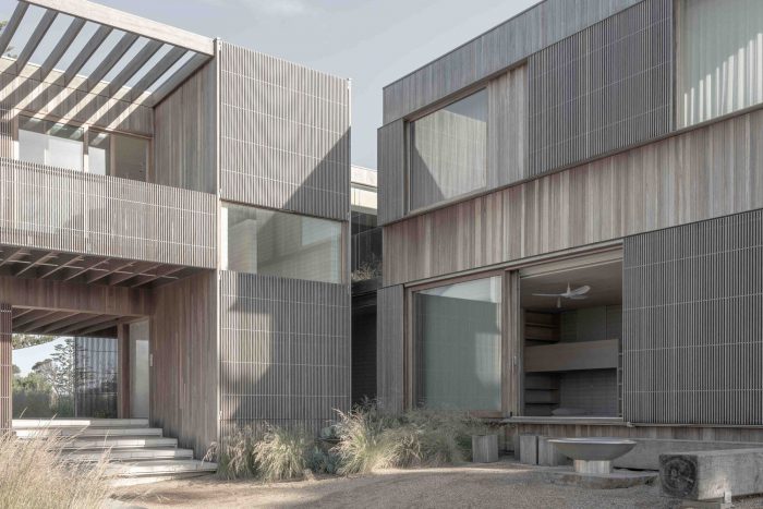 Our response is directly influenced by the project’s coastal surroundings, with a sensory narrative embedded in both external form and internal detail. Thoughtful spatial planning, strategic orientation, and materiality support the family’s traditions and idyllic beachside lifestyle. The house comprises three solid volumes loosely wrapped in a timber skin. By positioning the home close to its rear boundary, we abolish the traditional model of the backyard and front fence; instead establishing an immediate dialogue with the garden, and a distant connection to the ocean.