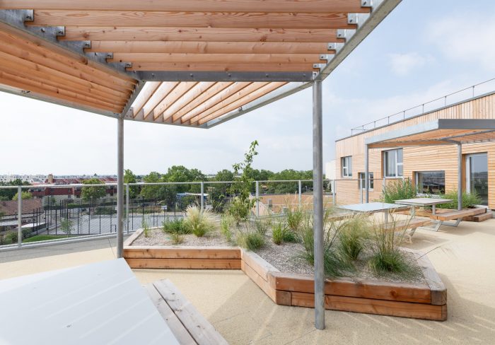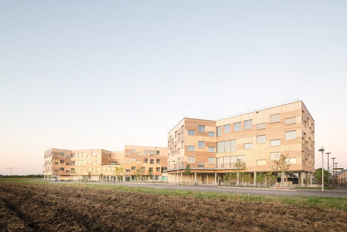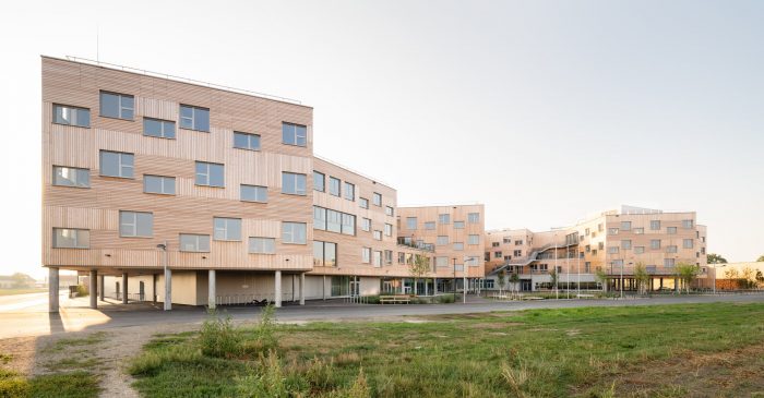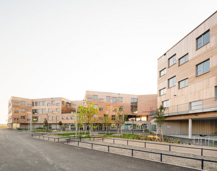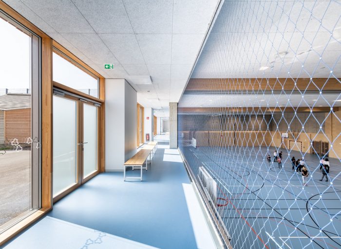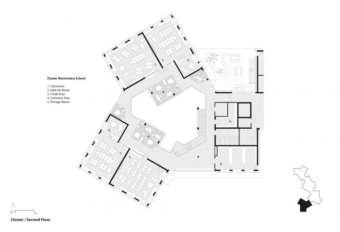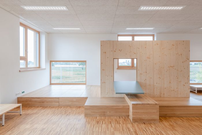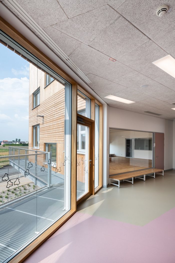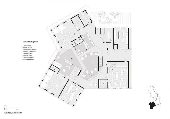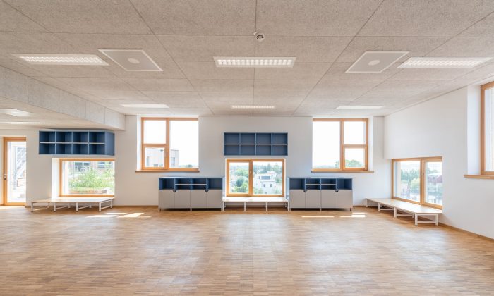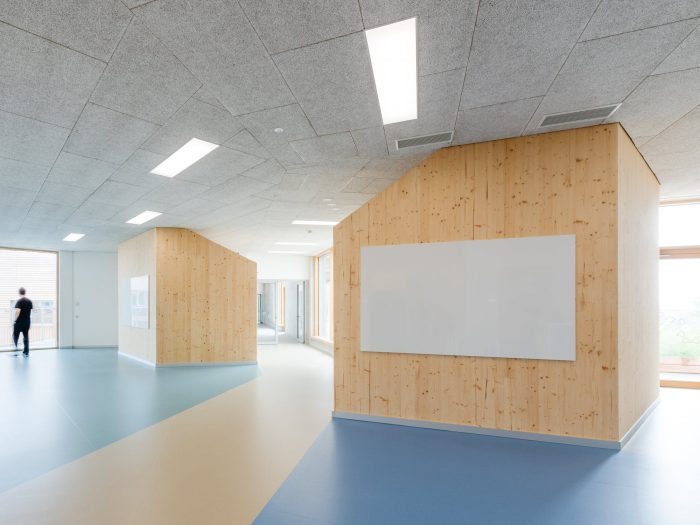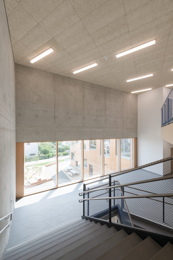 With a height of over seven meters these atria maximize visual and spatial connections while also generating sufficient opportunities for retreat and concentrated work with the help of curtains, seating galleries, mobile partitions and “reduced” room heights of just 2.2 m; some common areas offer views out into the surrounding area while others, which form internal balconies immediately adjacent to each primary school classroom, are oriented towards the heart of the atrium. All the classrooms are organized diagonally while each of the star-shaped learning clusters is illuminated by daylight from every direction. The articulation of the volume, the position of the “jumping” windows and the design of the playhouses in the kindergarten group rooms and the fitted furniture in the classrooms ensure that the building complex, with its alternating horizontal and vertical larchwood slatted façade, is a lively home from home for the pupils and pedagogues.