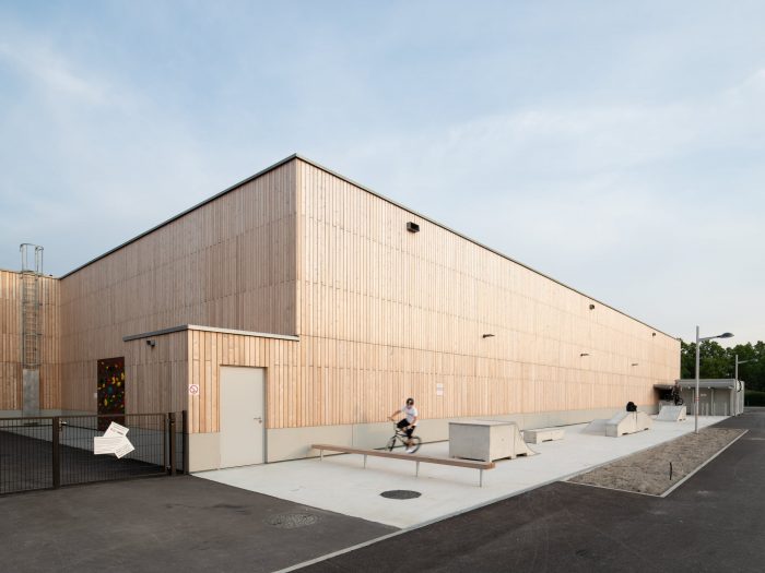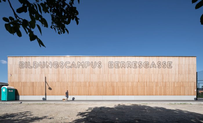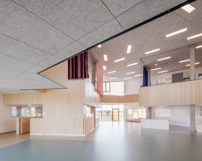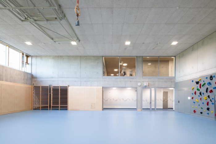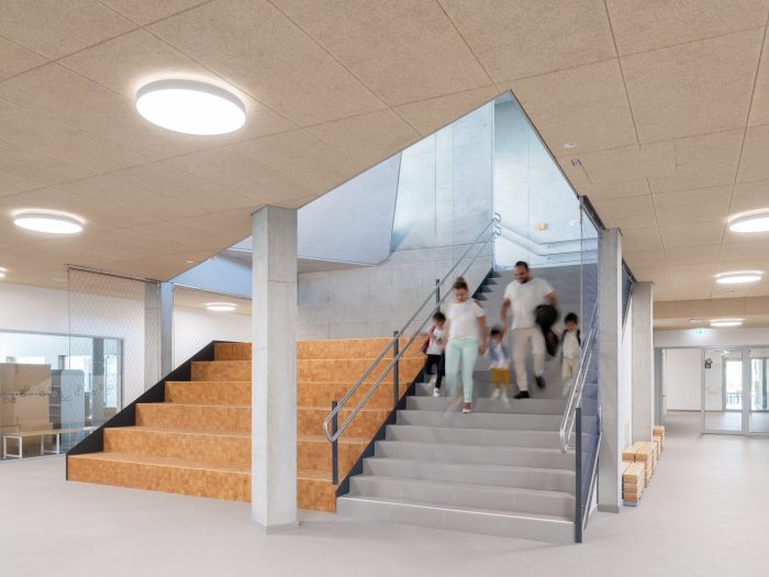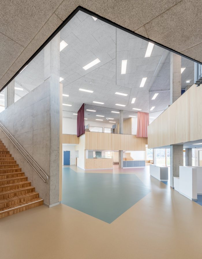 The building can be seen as a symbiosis of a range of typologies: a hybrid of a terraced, slab, bridge and hall structure. This is the first completed school project of this scale that has consciously replaced the orthogonal organization of the classrooms with a radial, windmill-like configuration that enhances the relationship of the spaces with each other and with the urban context. The kindergarten has been connected with the primary school via a central, hall-like two-story atrium. The central common areas in the atria of the individual BiBers can be used in a wide variety of ways: Their different zones permit age-specific interaction but also encourage a sense of community within a “BiBer family” that transcends the wide age-difference.