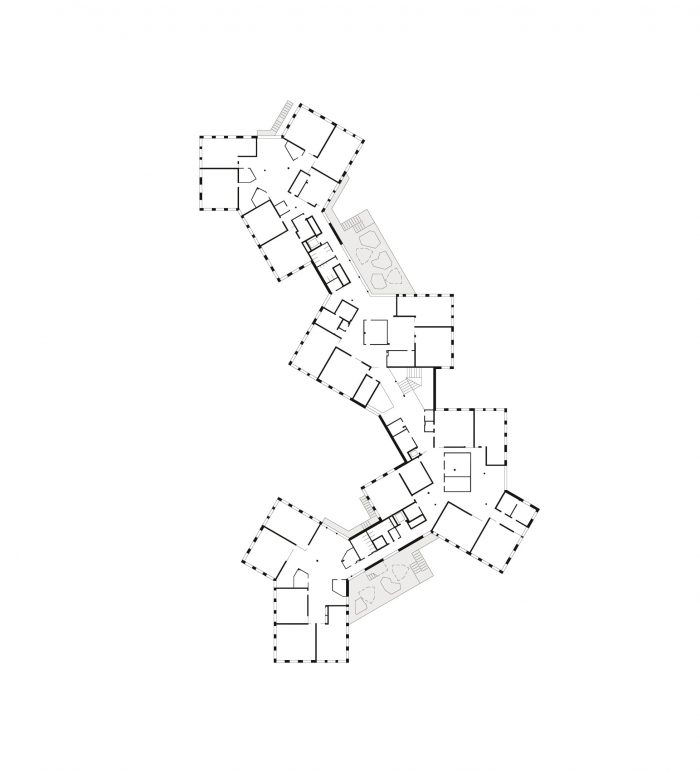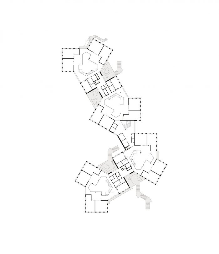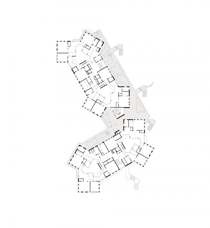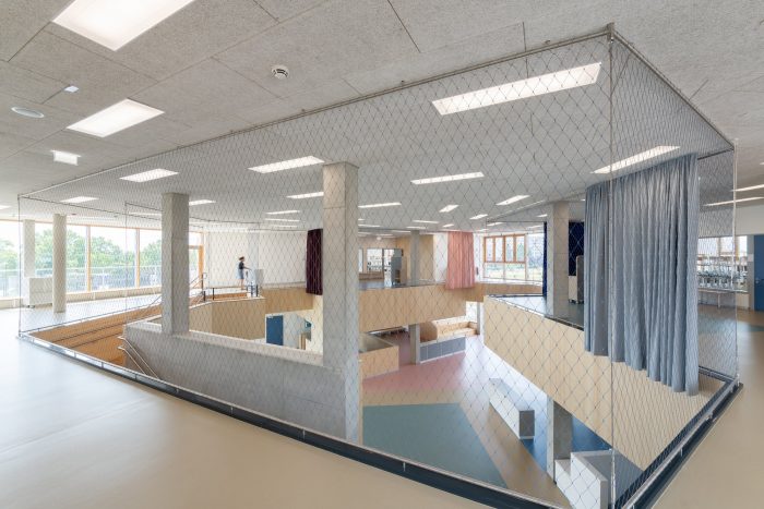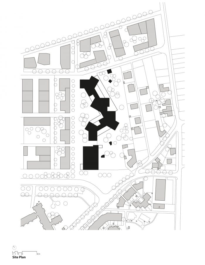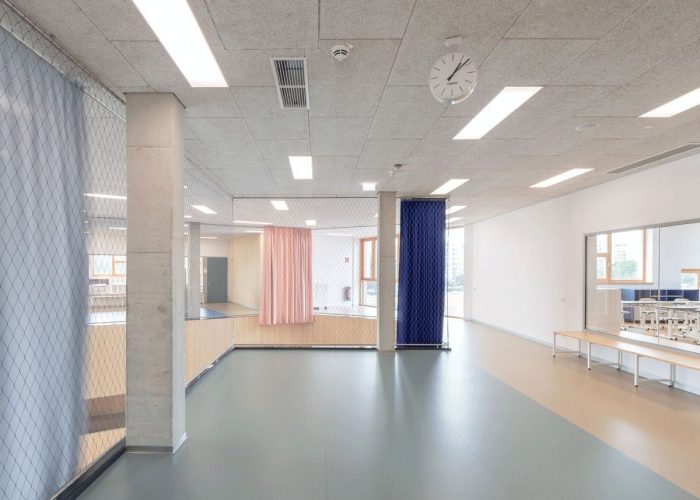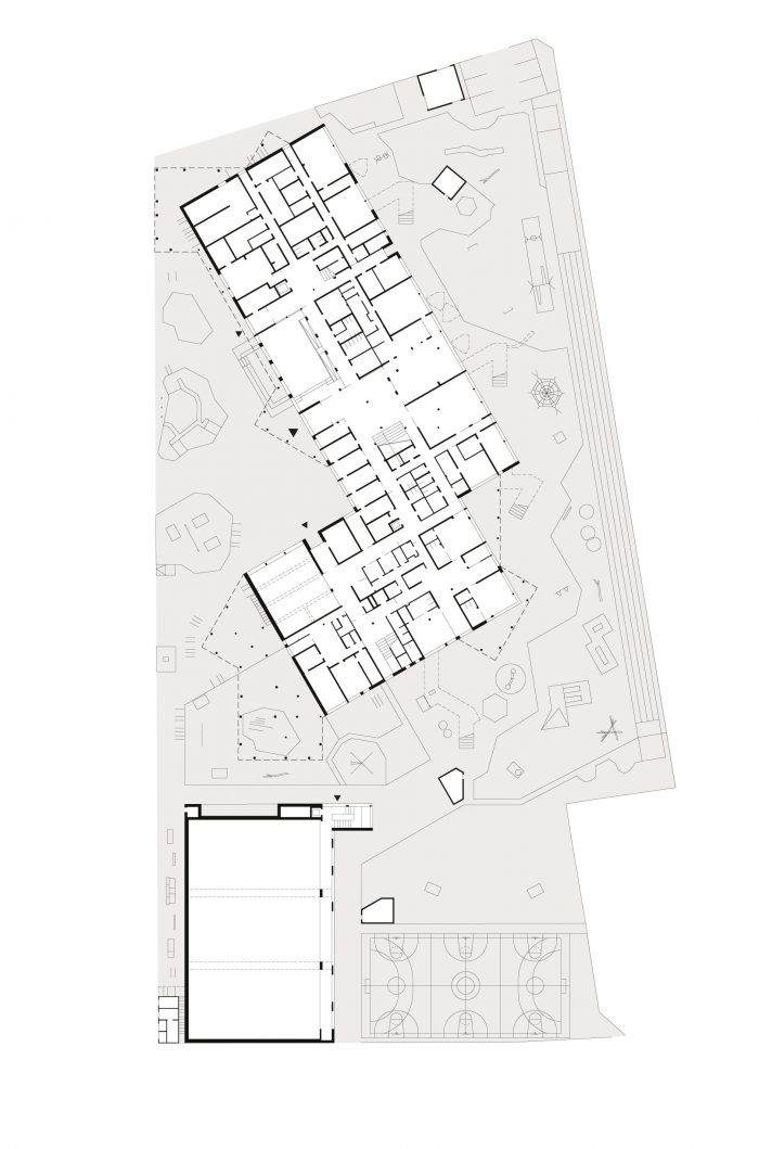 该建筑可以被视为一系列类型的共生体:梯田、板式、桥梁和大厅结构的混合体。这是第一个完成的这种规模的学校项目,它有意识地将教室的正交组织替换为辐射状的风车式配置,加强了空间之间以及与城市环境的关系。幼儿园通过一个中央大厅式的两层中庭与小学相连。各个BiBers中庭的中央公共区域可以以多种方式使用。它们的不同区域允许特定年龄段的互动,但也鼓励 "BIBER家庭 "的社区感,超越了巨大的年龄差异。