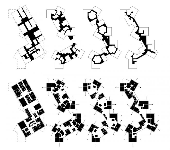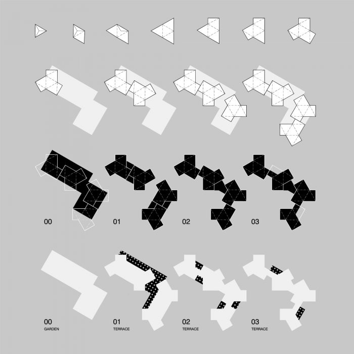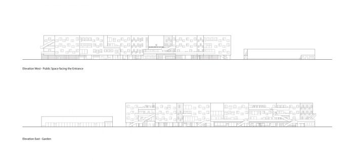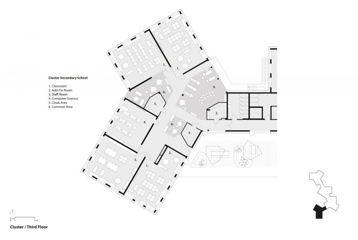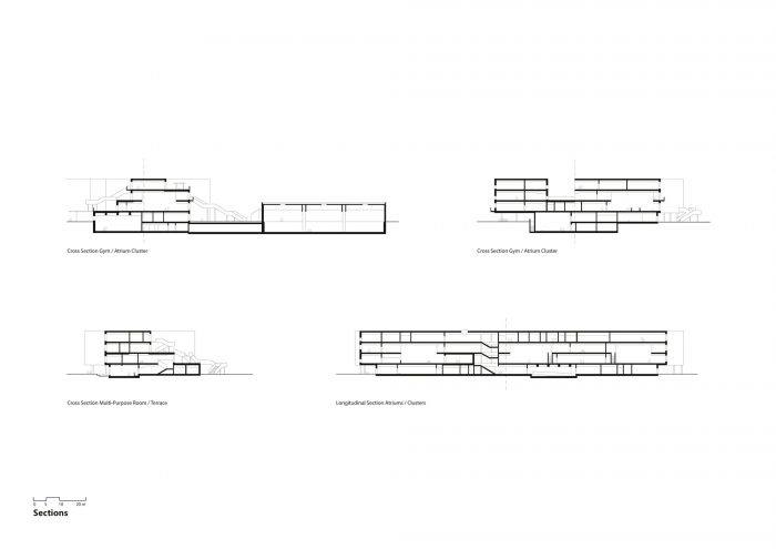 这个大型建筑群被组织成一连串易于识别和管理规模的学习集群,每个集群都有一个独立的入口,在城市环境中清晰可辨。建筑物被组织成一个类似于基地的底层,包含所有的一般空间,四个两层的幼儿园和小学的学习集群,占据了第一和第二层,两个横向布局的新中学的学习集群,位于第三层。从形态上看,该建筑经历了从矩形底层到第四层强烈衔接的体量的金字塔式缩小。这导致在所有上层有一个总面积约2000平方米的宽敞、相互连接的露台,其中一些露台包含丰富的绿色植物岛,有效地将花园扩展到第三维。