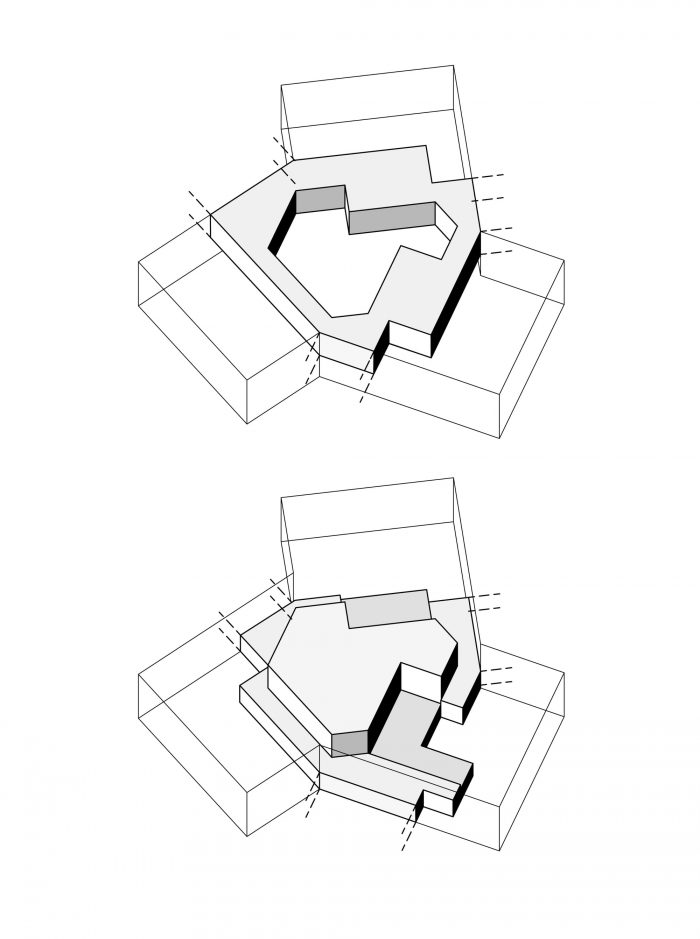 The objective of the project is to maximize the spatial synergies both between the local area and the campus and within the campus itself. This will allow the new educational campus to position itself as a laboratory and a testing station for new educational practices – in a similar way to a kaleidoscope. The multifaceted, north-south oriented volume of the educational campus meanders across the site, creating three different and contrastingly treated external areas: a publically accessible, v-shaped forecourt, located on the street to the west, a richly planted area of open green space for the campus, and a third area that is dominated by the sports hall and the multipurpose hard court.