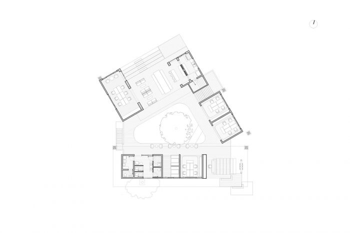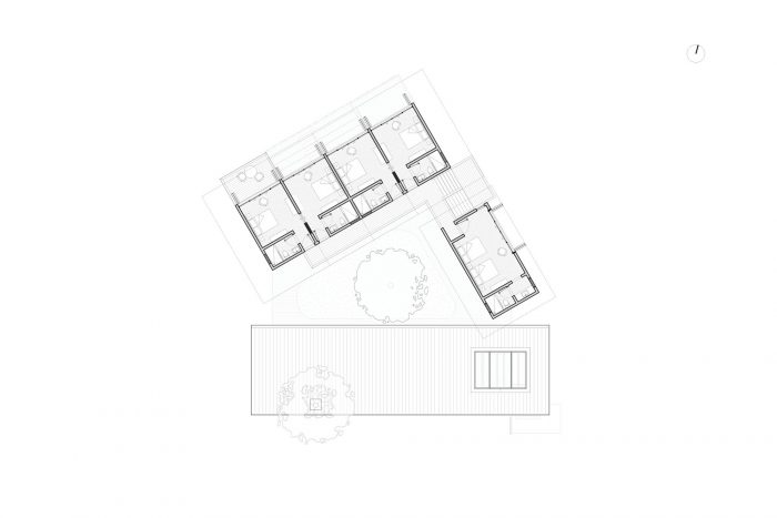 该建筑为混合使用而设计,在围绕中央花园建造的三个模块中,将工作活动与生活和住宿空间相结合。朝南的模块构成了项目的主立面;因此,它被强加了一个大的双高屋顶,由钢柱和连续的木板支撑。这个模块接待游客,并设有会议室和服务。穿过中央花园的走廊,朝东的模块将工作和休息区分别分布在两层。朝北的模块,除了向海滩开放外,还在两层结合了各种用途的空间:生活区、协作工作区、厨房、卧室和一个公共露天餐厅。