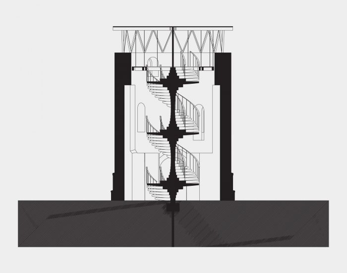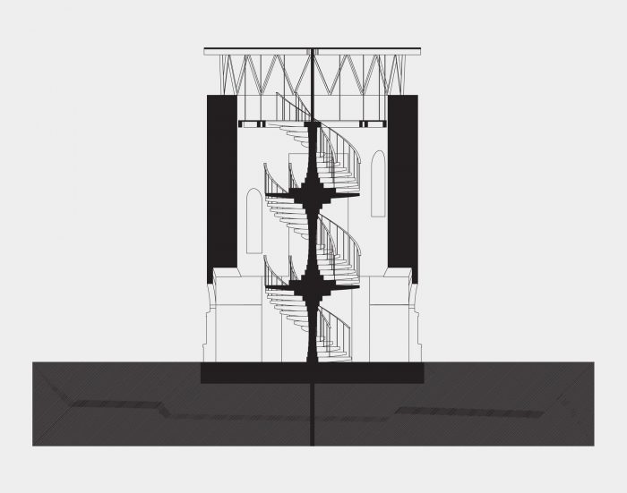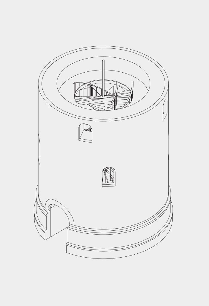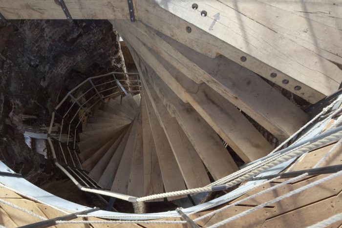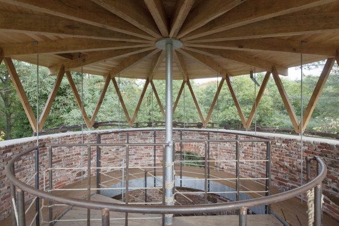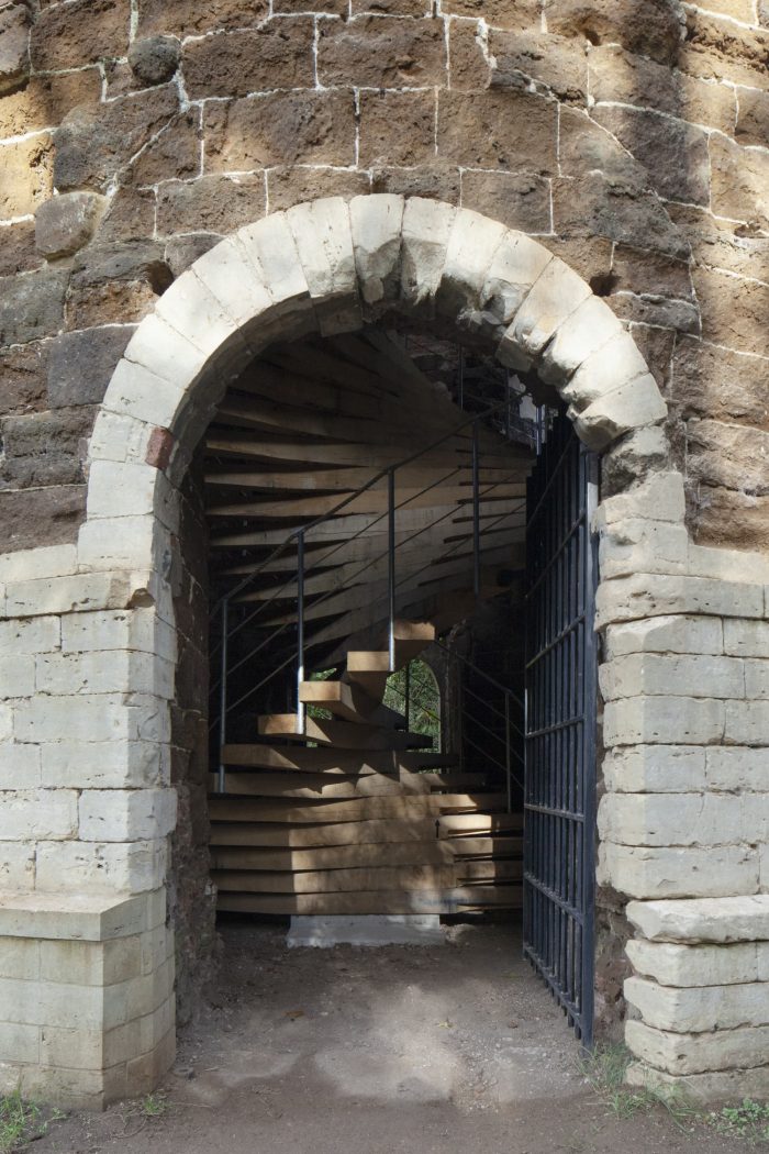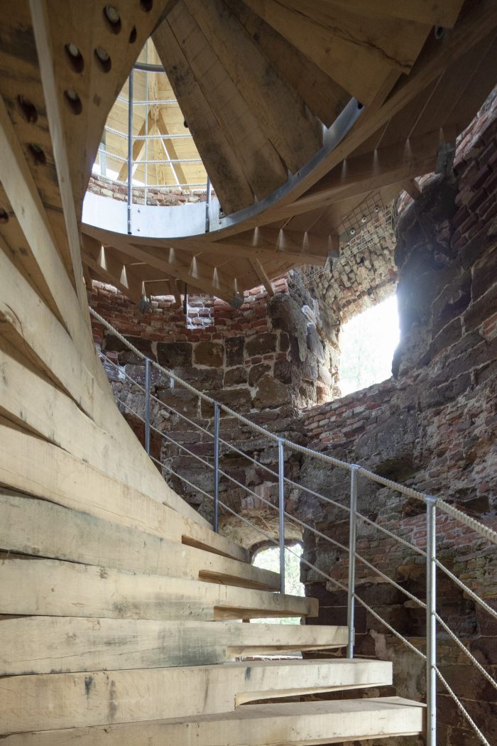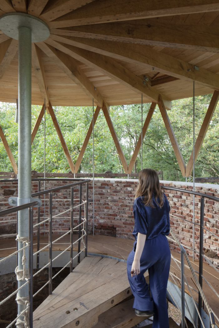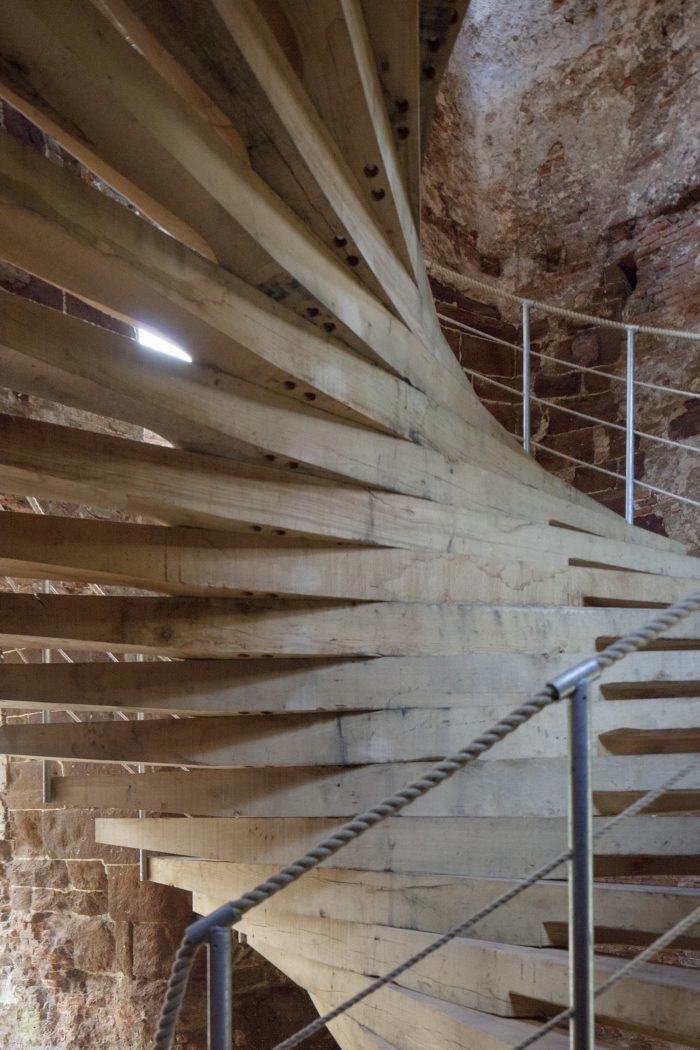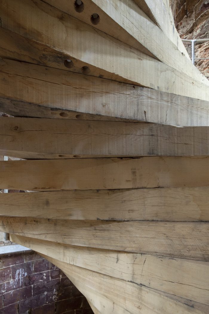 橡木楼梯(双螺旋)是一个当代的干预措施,它曾经是木制磨坊的建筑。旧的地基构成了新的木结构的基础。