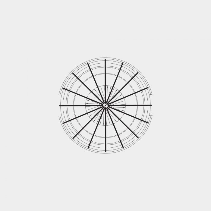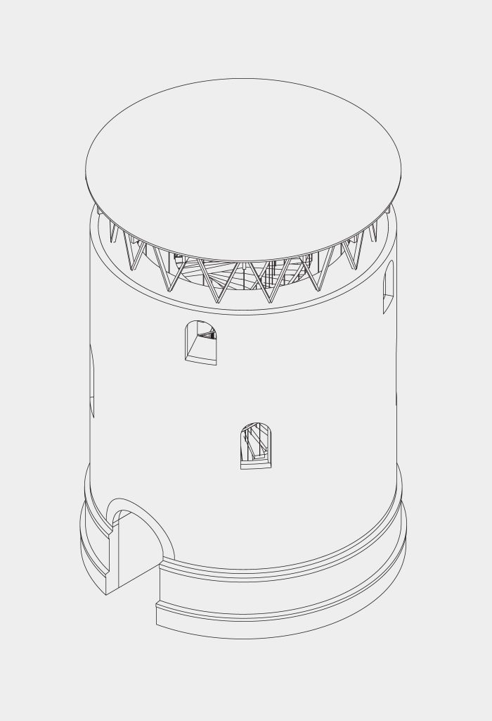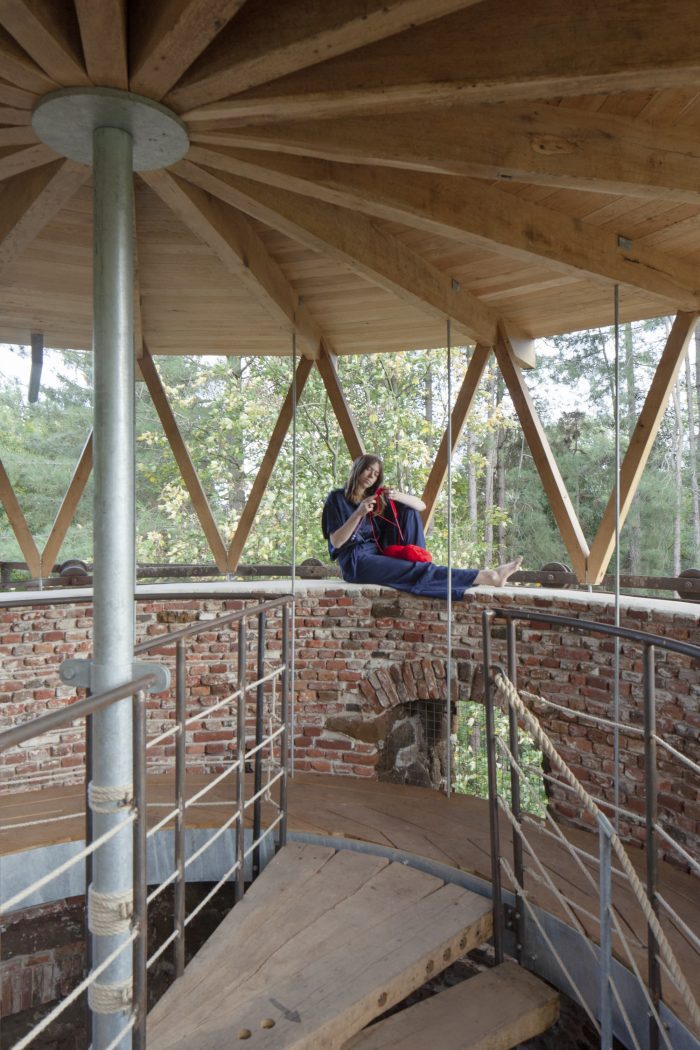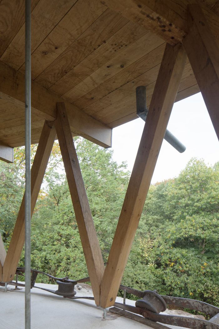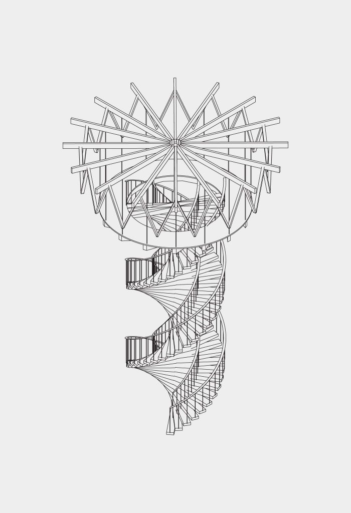 The staircase construction allows one to experience this expressive spectacle in detail. The roof structure is a reciprocal floor structure suspended from a drum structure.