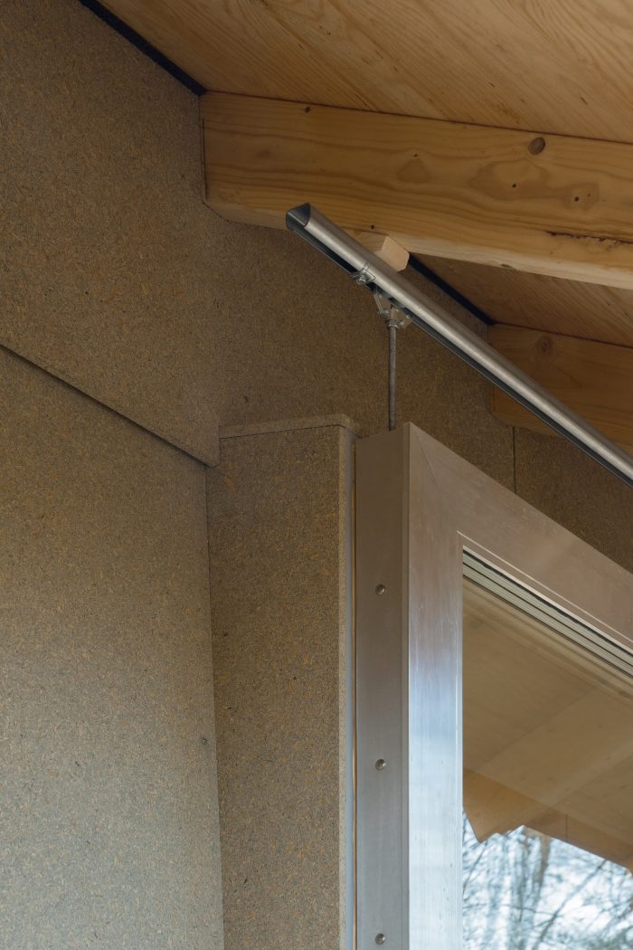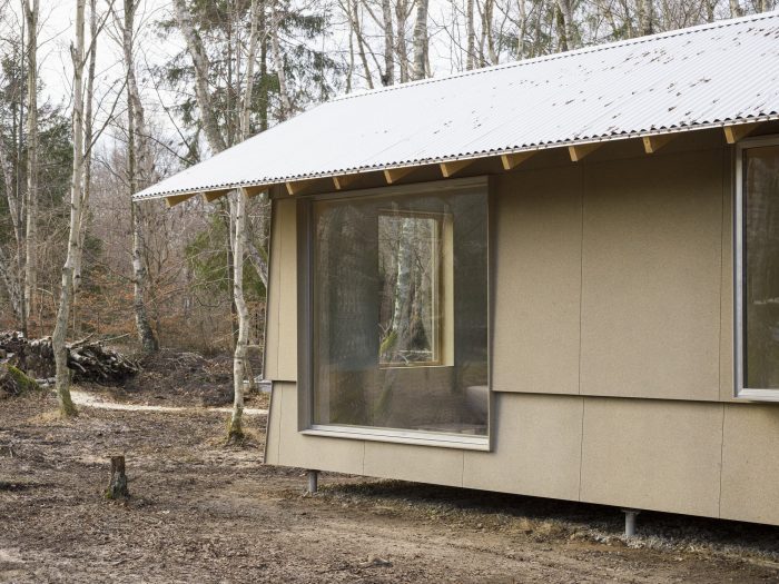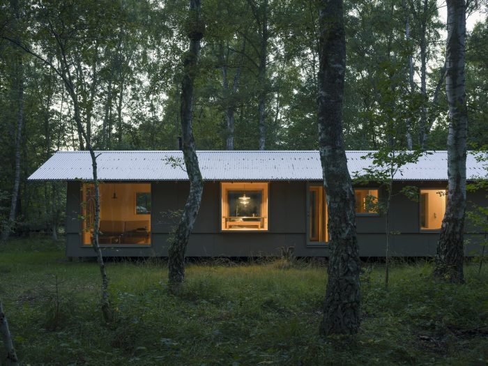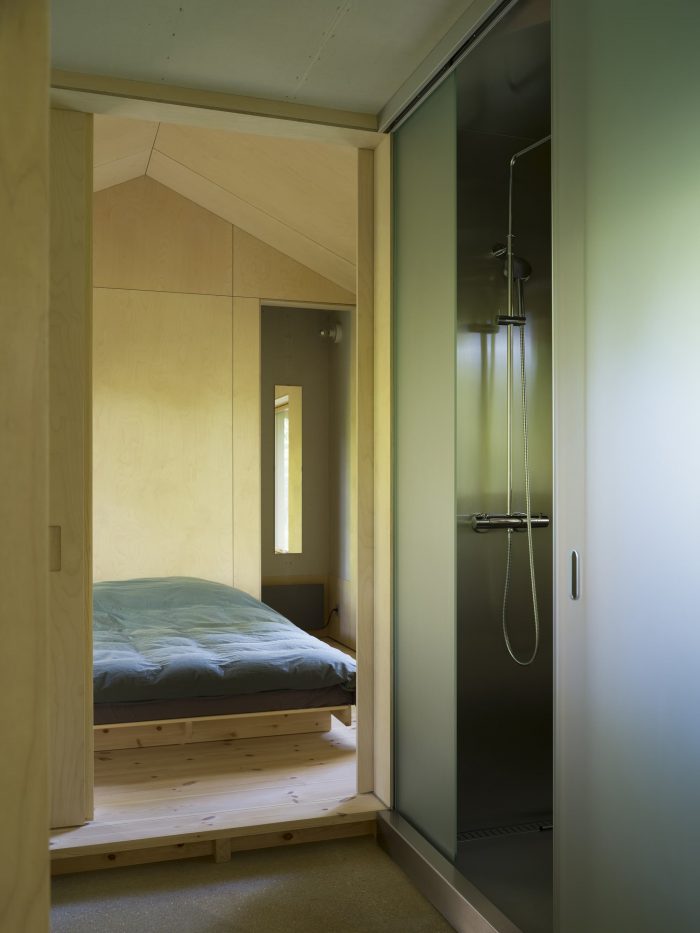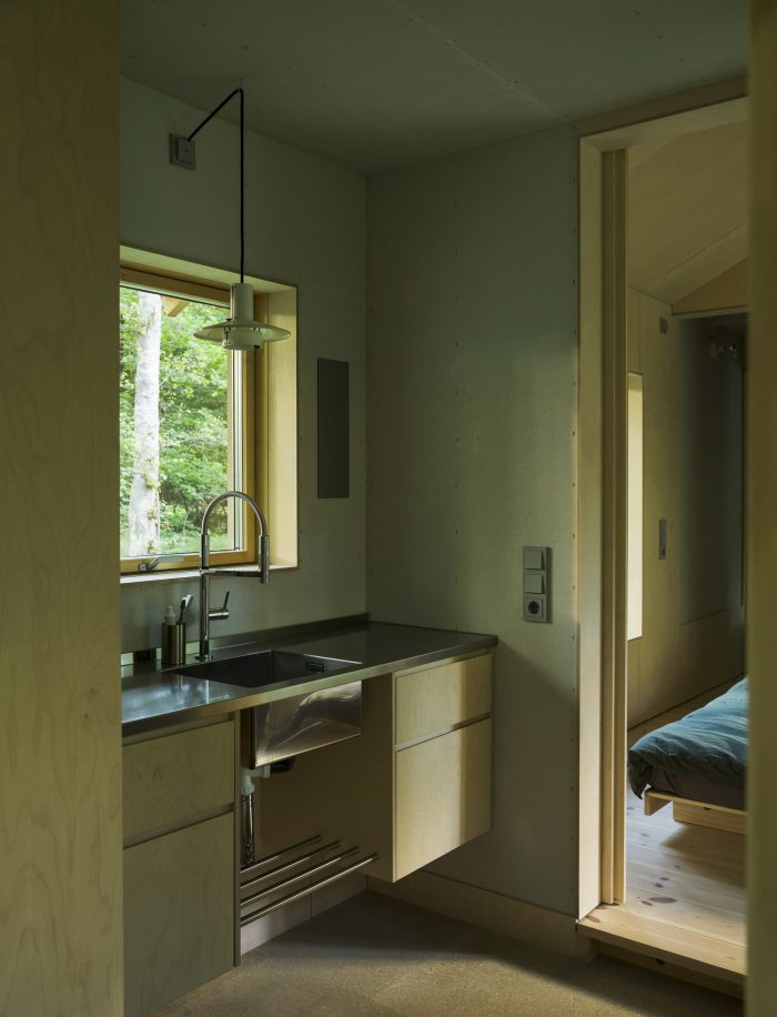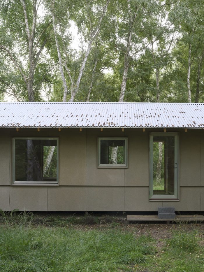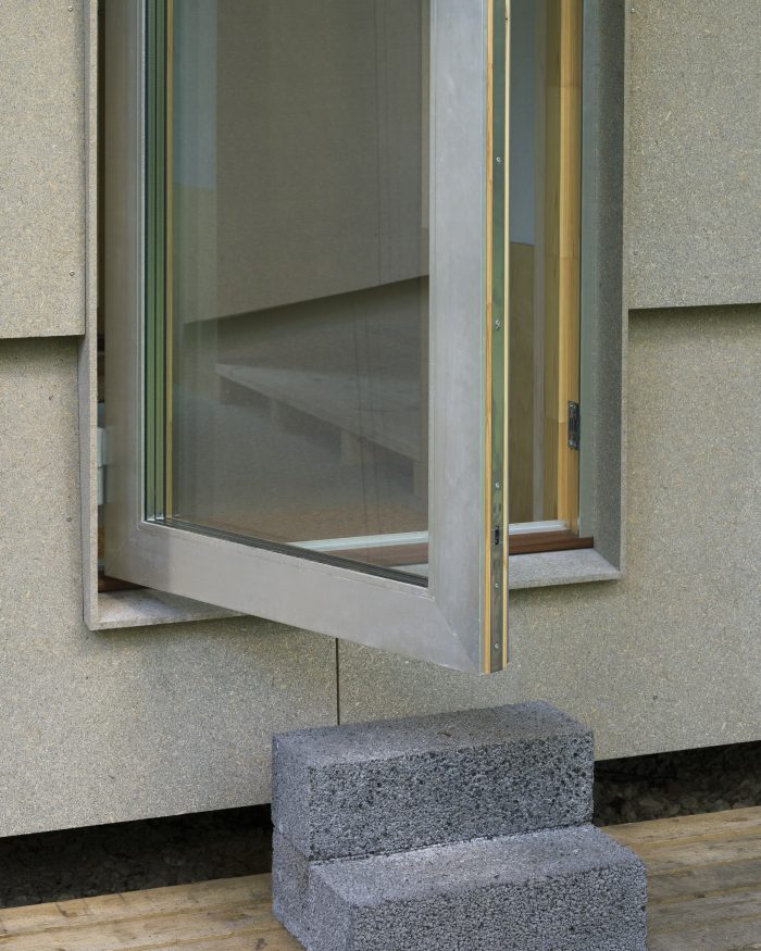 The house’s facade sheets generate thin, shadowy lines across the structure, producing a subtle sense of hovering. The airy aesthetic is apparent throughout, from the thinly cut metal pieces making up the bathroom to the delicate wooden frame and its low-density wood fiber insulation.