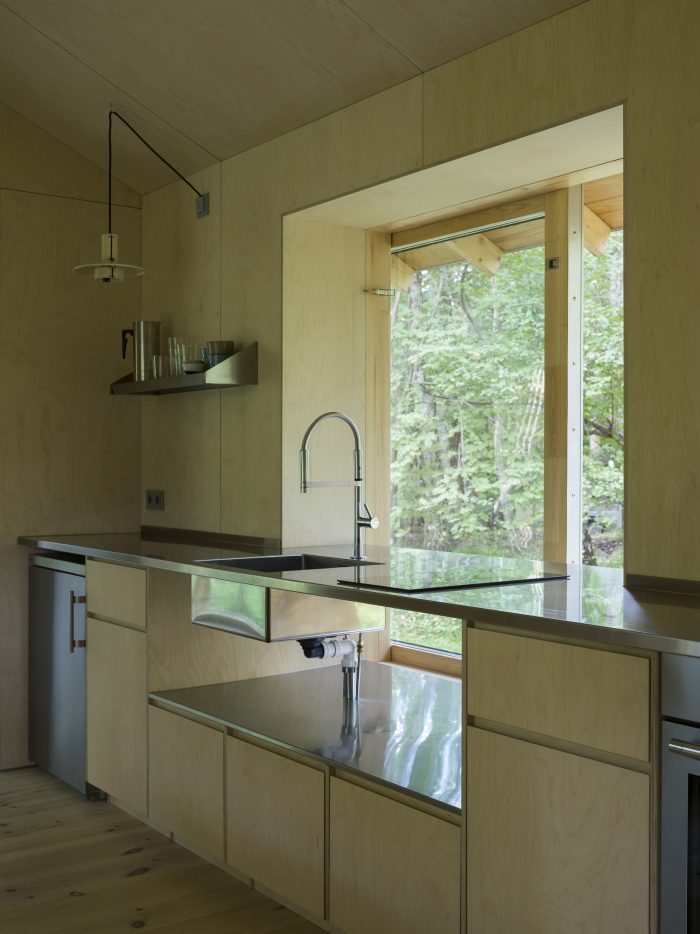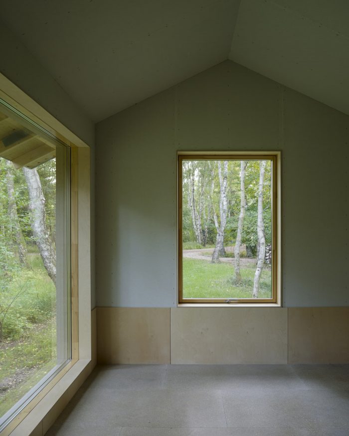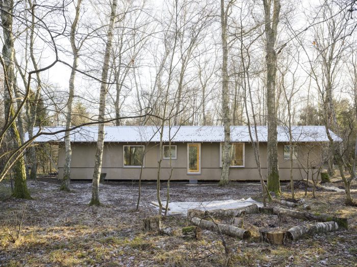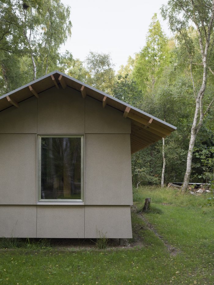 Built without a concrete foundation, the house rests gently on helical pillars, leaving the forest floor nearly untouched. The corresponding lightweight, wooden construction and modest material palette endue the house with a temporary yet natural presence in the landscape.