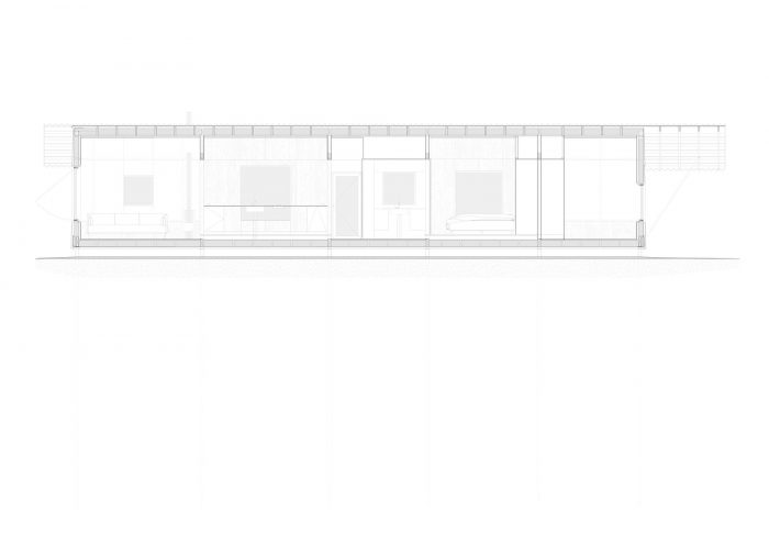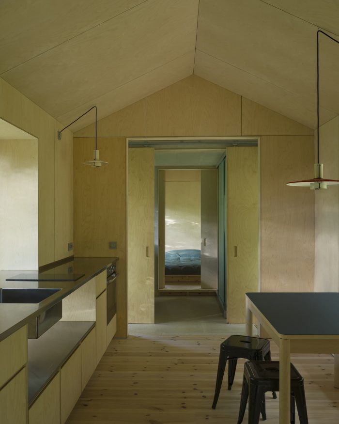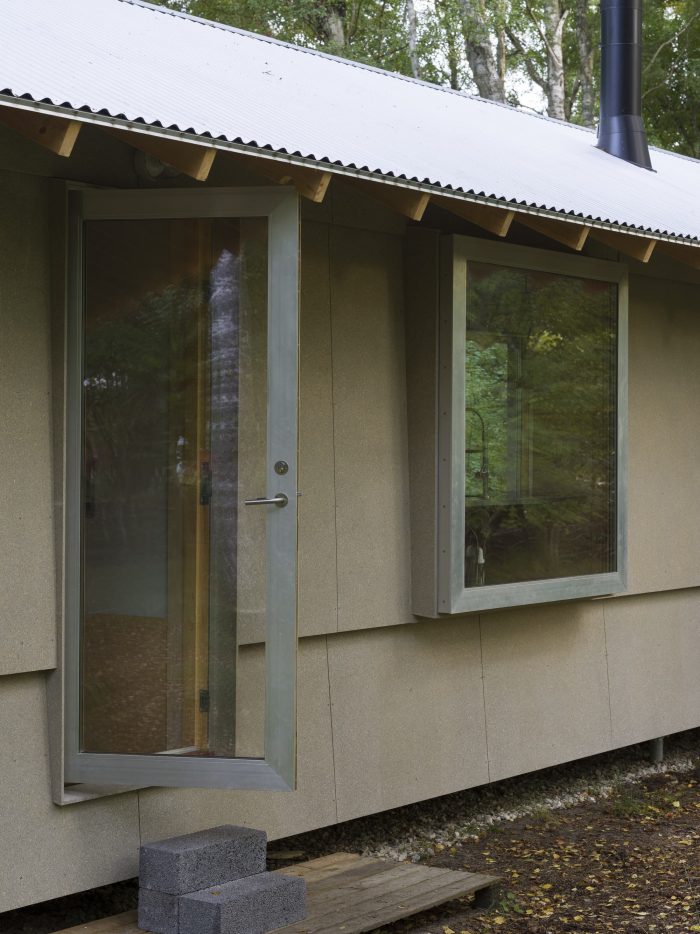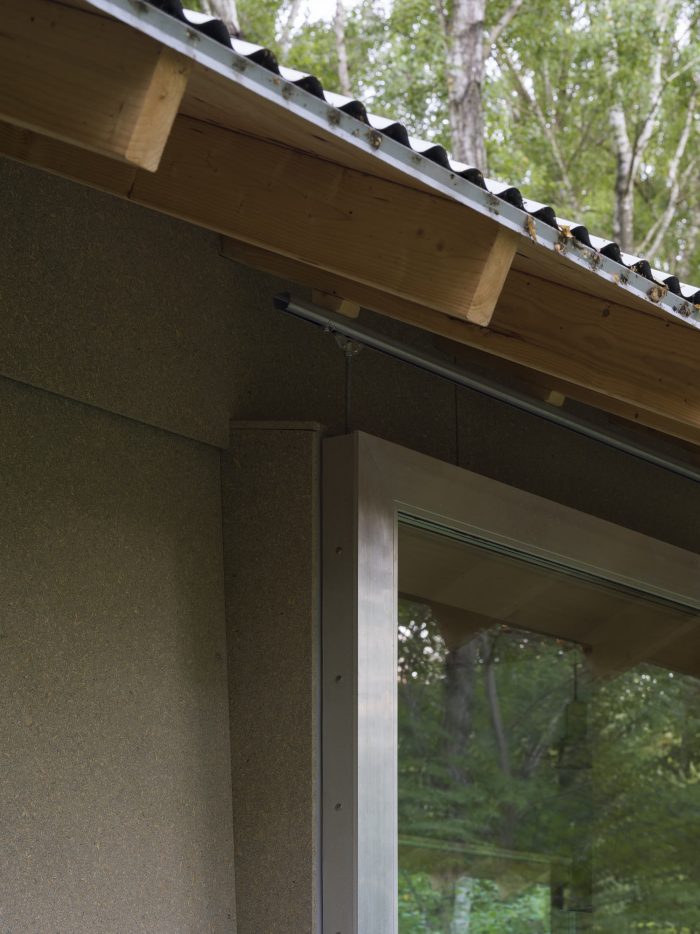 房子的外墙板在结构上产生薄而朦胧的线条,产生一种微妙的盘旋感。从构成浴室的薄薄的金属片到精致的木质框架及其低密度的木纤维绝缘材料,空气美学贯穿始终。