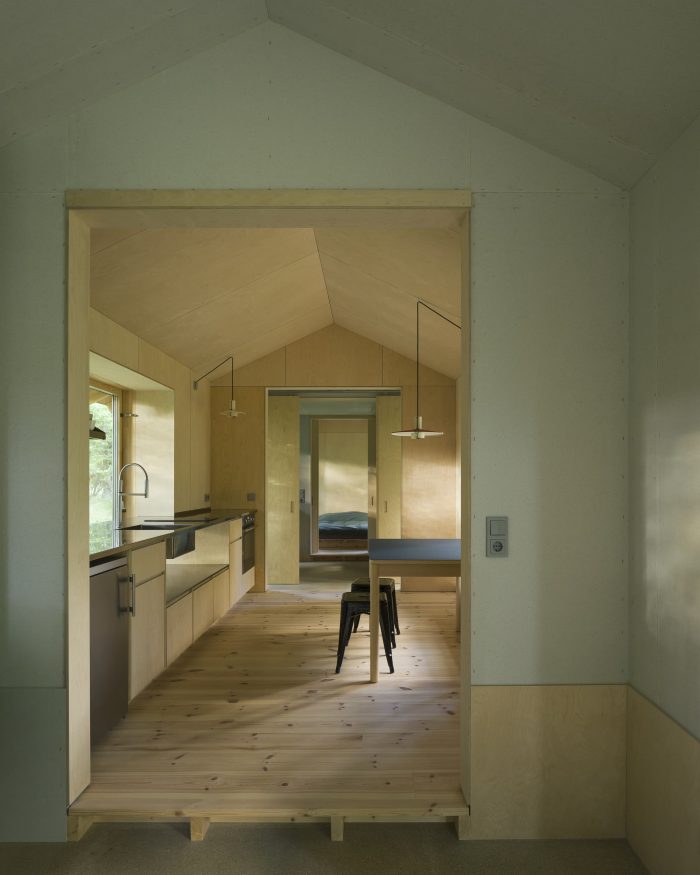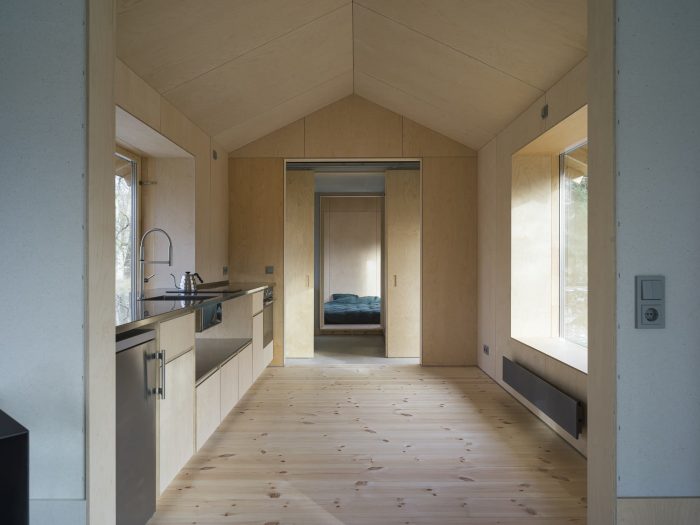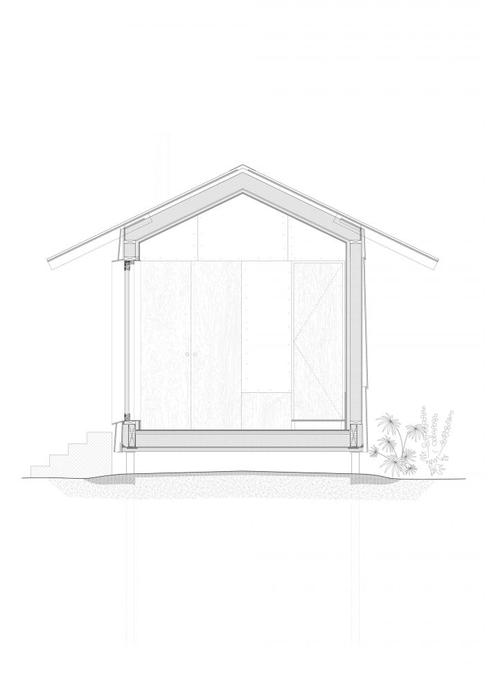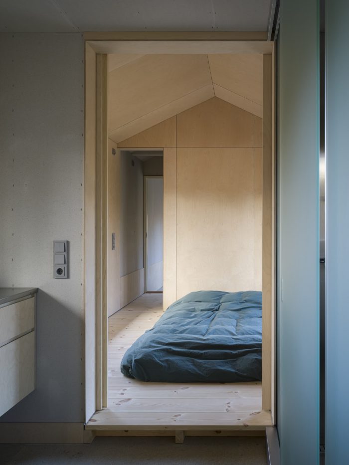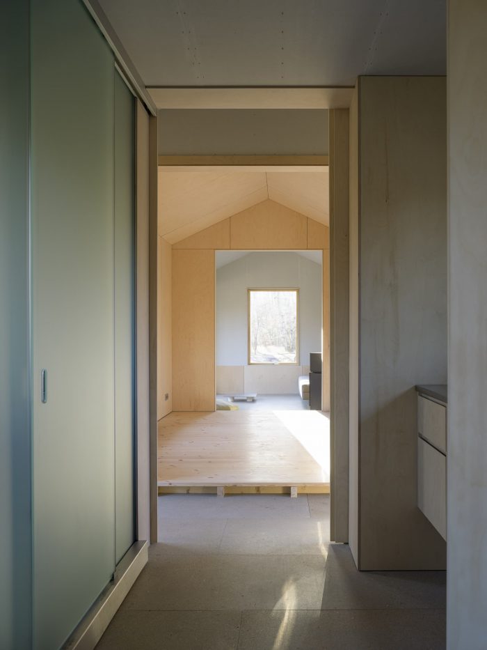 Birch plywood is economically applied only where the body and walls come into contact, reducing material use and exposing different layers in the construction. Structural elements are left visible and allow one to recognize and follow the becoming of the house, creating an experience of temporal lightness.