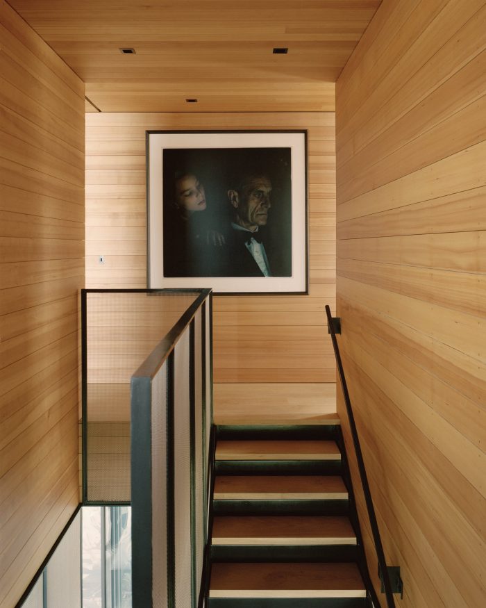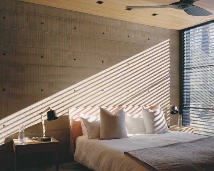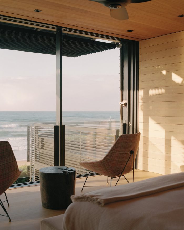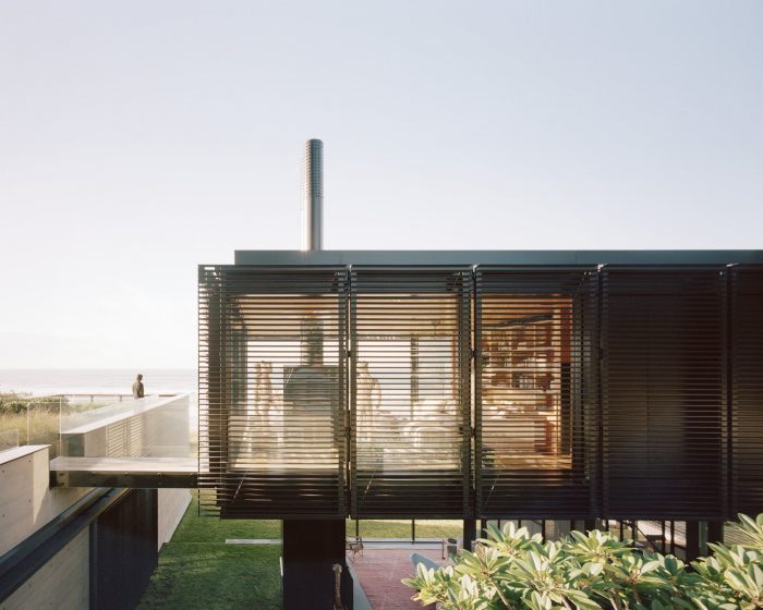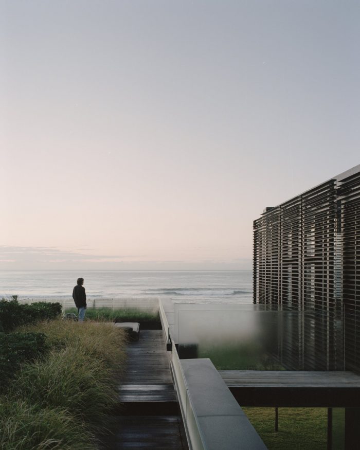 The color of the home’s board-formed concrete walls references the color of the local sands, relating the architecture to its site and helping it merge with the natural condition of the headlands as it weathers over time.