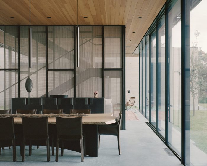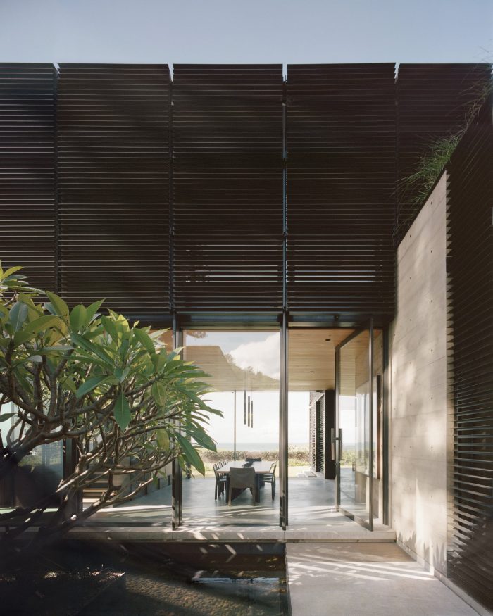 At the same time, the design allows the family to connect with the natural environment, with shaded retractable window walls that merge inside with the outside and provide passive ventilation. An interior courtyard brings filtered daylight into the core of the home, where a central water feature helps to cool the air.
