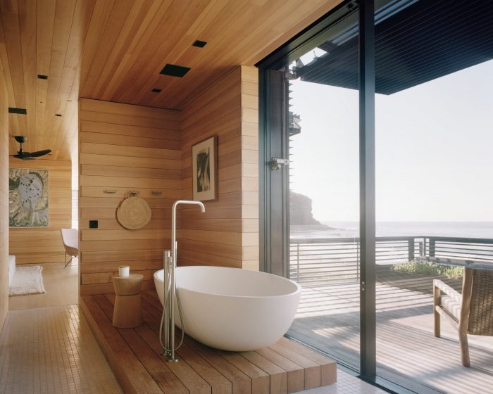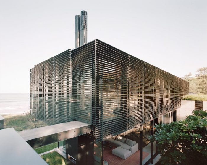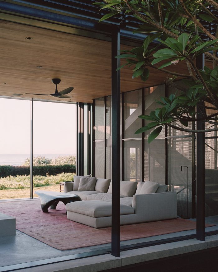 Nestled in the sand dunes of Bilgola Beach, this 9,400-square-foot family home is located on the northern coast of Sydney, Australia. Passing through palm trees and Norfolk Pines, the site’s entrance leads through the solid volumes of the home’s main and guest wings. Upon approaching the front door, the view opens up to the sand dune and beach beyond.