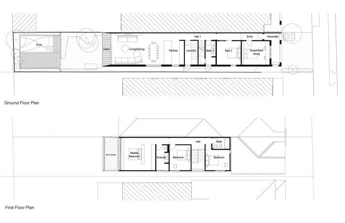 为了容纳一个不断增长的家庭,建议在一个新的屋檐下扩建一个上层。上层建筑坐落在现有临街屋顶的屋脊后面,最大限度地减少了二层建筑的外观。新的坡屋顶形式受到现有屋顶角度的影响,创造了一个结构,虽然明显是现代的,但与现有的房子及其周围有一个独特的设计关系。