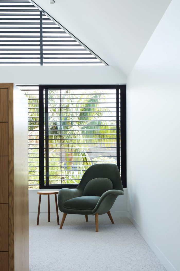 Internally the gable form creates a number of dramatic volumes that you would not expect in a house of this size. The culmination of these spaces is the main bedroom which looks out to the rear garden through a filter of plants and louvres.