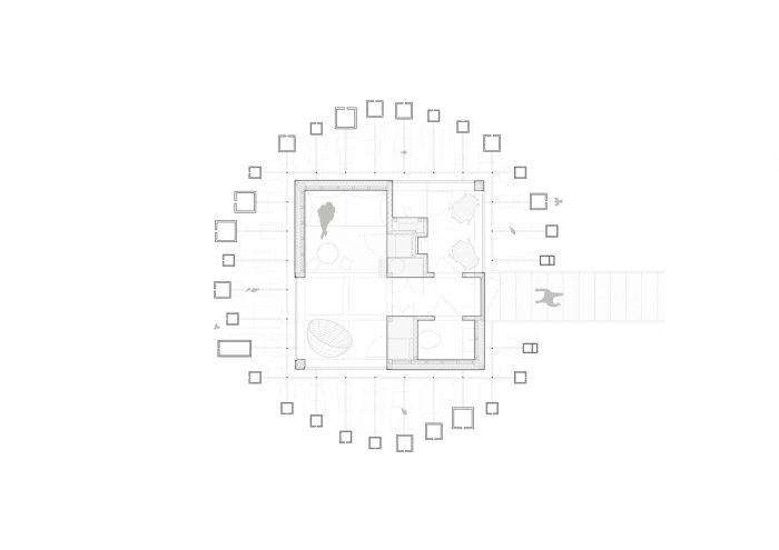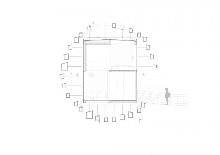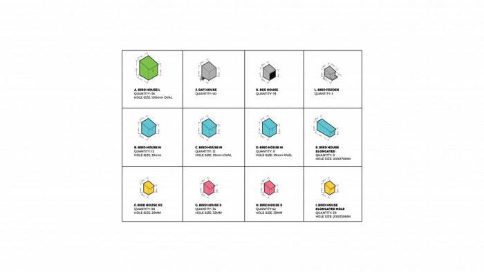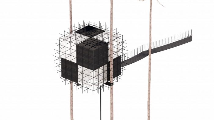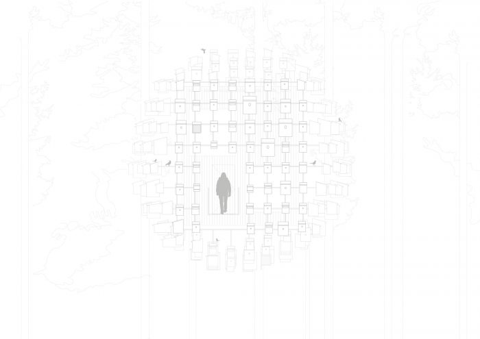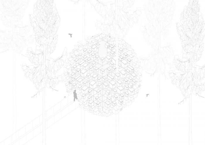 The interior is simple and pragmatic, yet due to its checker solid-open conceptual make-up, allows for a range of experiences within a relatively small space. Visitors have access to a roof terrace – close to the treetop canopies – that offers 360-degree views of the forest. By varying the individual sizes of the bird nests and expanding them outwards, and based upon the bird type and frequency in the area, light is able to enter the interior space whilst maintaining the outwards views.