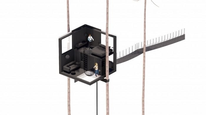 The biosphere is accessed via a suspended bridge that slopes from the ground to the top of the trees. The interior of the 34m2 hotel room incorporates rich dark interiors and organic materials inspired by the surrounding landscape, which further serve to reinforce the visitors’ gaze outwards and focus on the natural beauty of the surroundings.