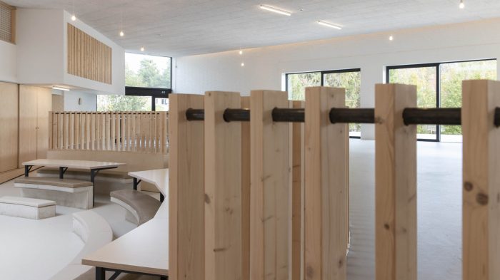 功能性。孩子们比以往任何时候都更需要一个温暖的小窝,一个休息的地方,同时也需要一个能邀请行动、探索和发展个人能力的地方。由于经典的高大的独立墙柜难以与建筑协调,而所需的扶手是沿着环形走廊设计成背靠背的柜子;一方面可以从走廊和角落进入,另一方面可以从生活层和运动层进入。柜子和扶手的双重功能使得节省材料成为可能。结果看起来清新而现代。它说明了转换的力量。次要房间(会议室、圣器室......)被改造成了学习、睡眠或工艺空间。宽大的坡面是根据每个人的无障碍性而建造的(轮椅使用,但也包括带婴儿车的父母)。