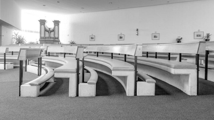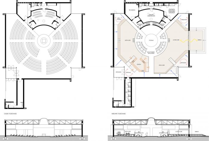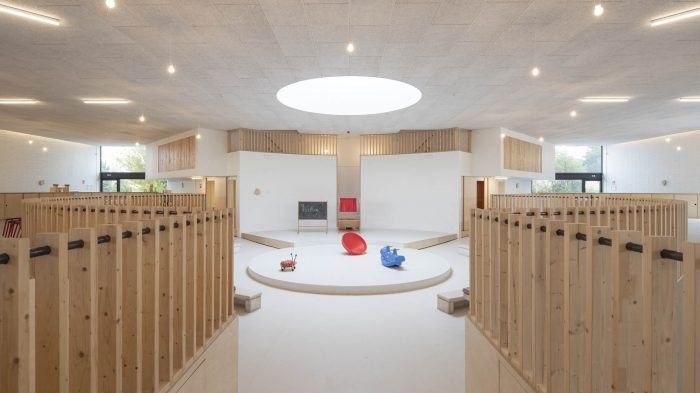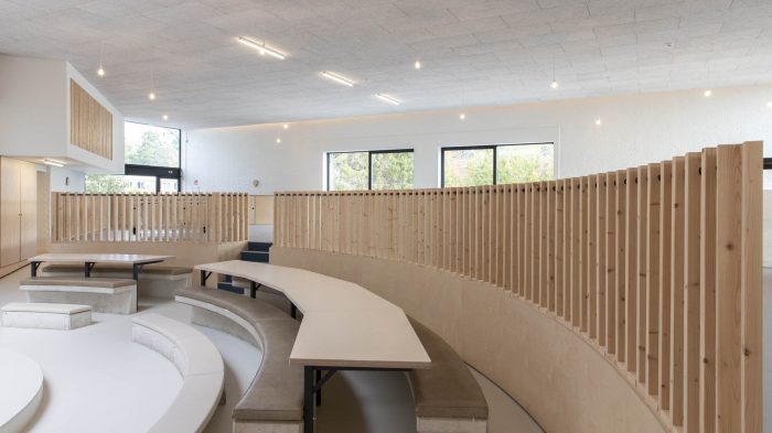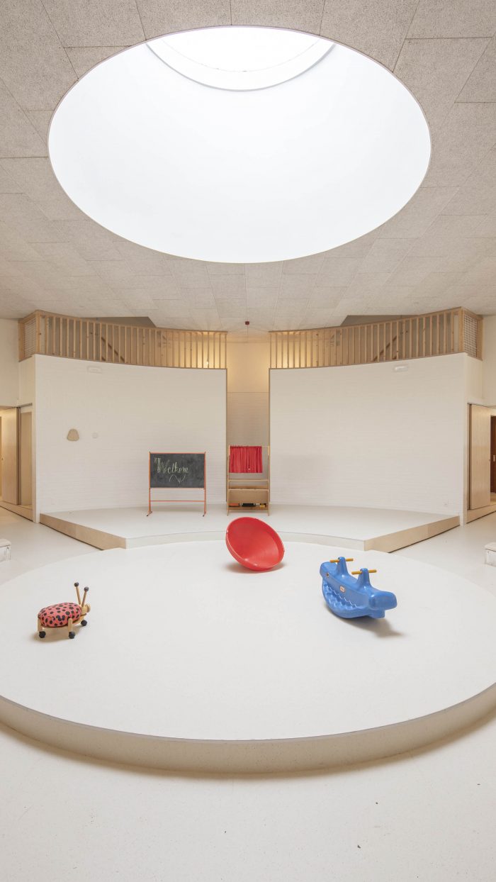 The existing church was characterized by one large rectangular space, without naves. The circular floor plan organized around the altar, with ascending rows of benches and dome crowns, evoked a sacred dimension. The liturgy was celebrated on a central plateau, to which all seats were directed. Many of these elements could be "recovered" and used as an asset. The conversion respects the existing planning organization, around a center, accentuated by a zenithal daylight injection. The first two bank rows are left in function. They unite the children around a storytelling moment or puppet theater.