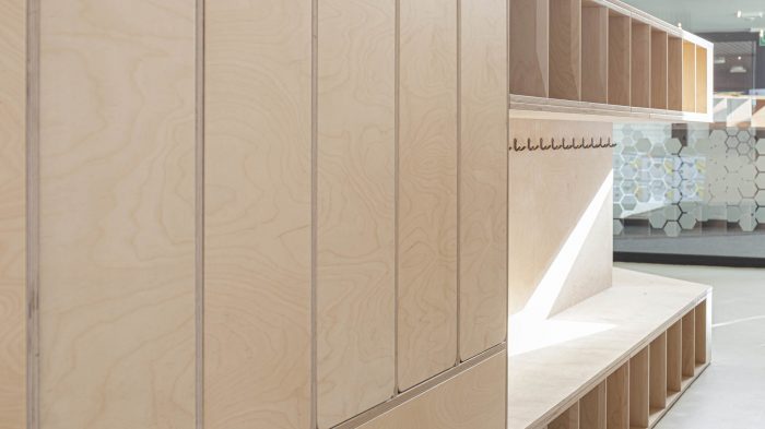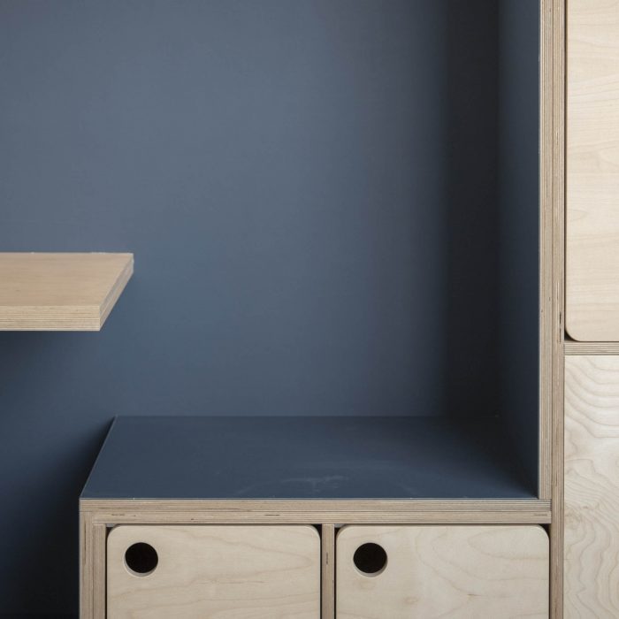 Functional. More than ever before, children need a warm nest, a place of rest, but also a place that invites action, exploration, and the development of personal competencies. Because classic, high, free-standing wall cabinets were difficult to reconcile with the architecture and the required handrail was worked out along the circular hallway as a back-to-back cabinet; accessible on the one hand from the hallway and corners, on the other hand from the living and exercise floors. The dual function of the cabinet and handrail made it possible to save on material. The result looks fresh and contemporary. It illustrates the power of conversion. The secondary rooms (meeting rooms, sacristy,…) have been transformed into study, sleeping, or craft space. Wide sloping surfaces have been constructed based on accessibility for everyone (wheelchair use, but also parents with a buggy).