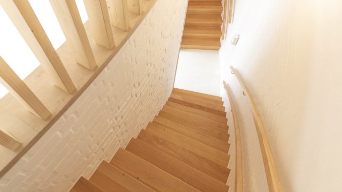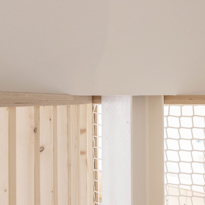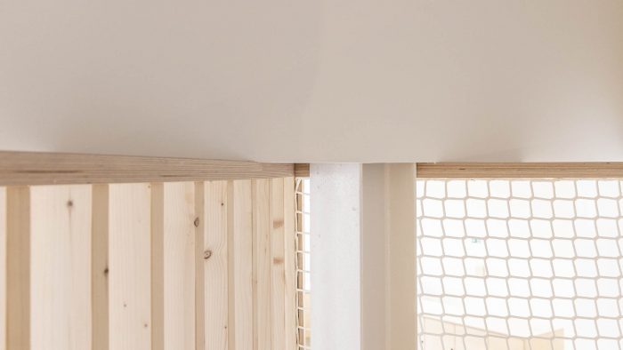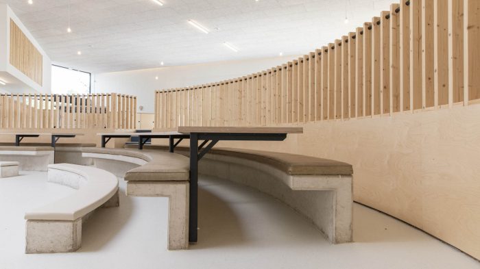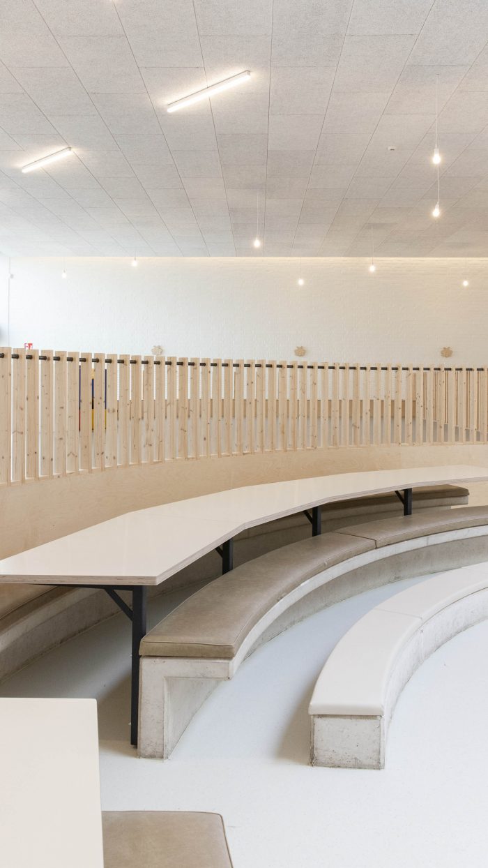 The visual readability and spatial effect were monitored. High walls, cabinets, or volumes that would crumble or divide the space were avoided. The sloping floor and the concrete benches have also been retained. To create the new living and exercise floors, they were covered with a wooden structure, which can be removed at any time. Circularity at its best!