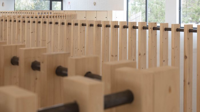 The apparently no longer usable space between the benches was made laterally accessible by means of shutters and serves as storage space. Among other things, the former bench handrails with bookshelf are preserved there. The design finds a new balance between historical and architectural values on the one hand and new needs on the other.