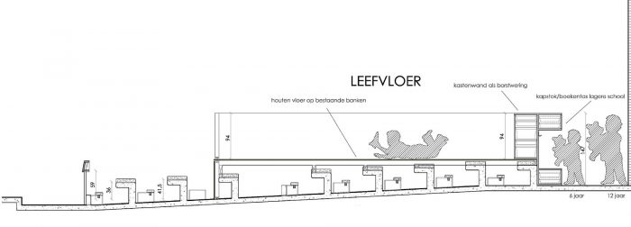 The architectural spatiality, the child-friendliness, the circular approach, the energetic upgrading, the accessibility, and the double use elevate the project to an exemplary project. We are only "guests". Because the new function is the result of an acute need that may evolve over time, the previous city architect Filip De Pau considered it irresponsible to permanently change the building through hard, expensive interventions. The competition specifications, therefore, stimulated a reversible intervention. We are only "guests".