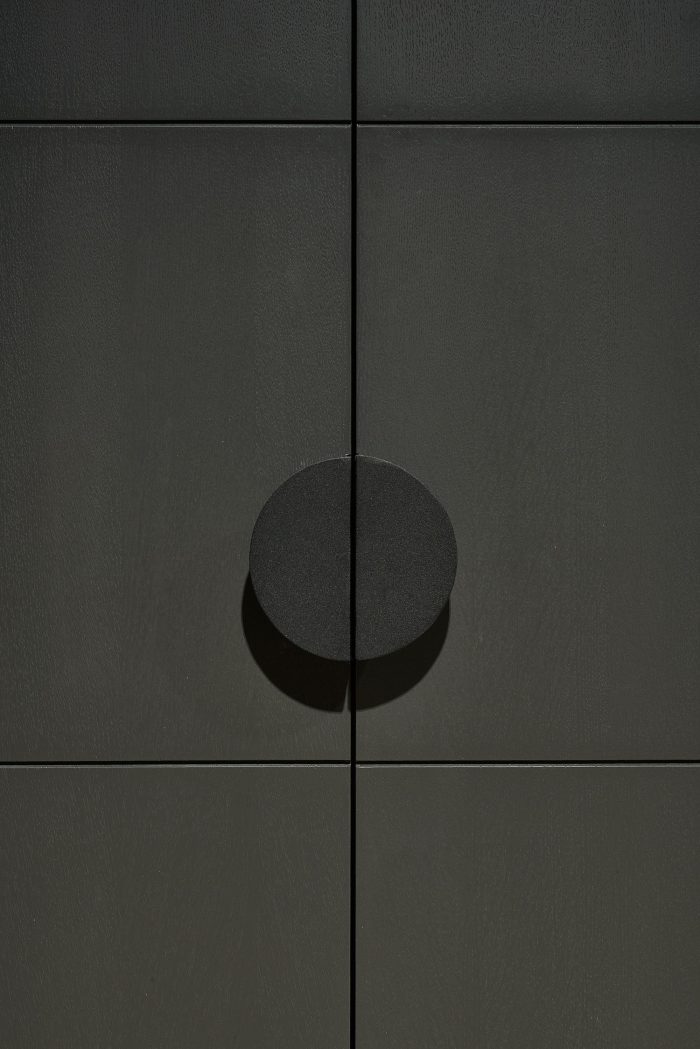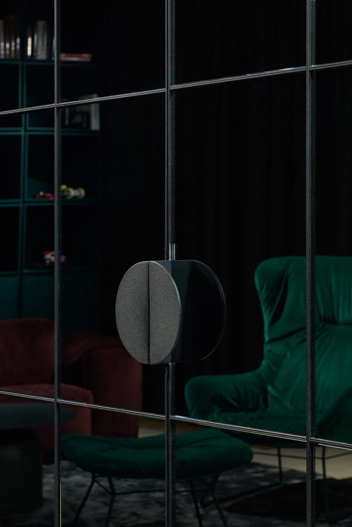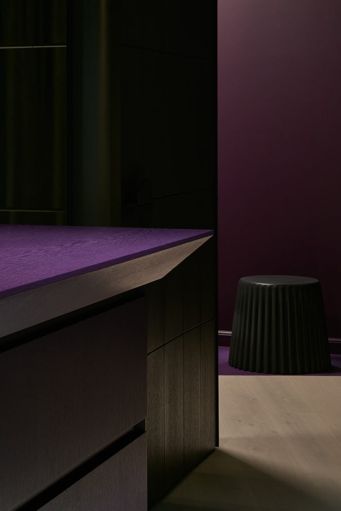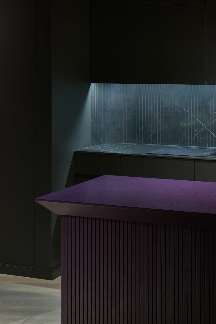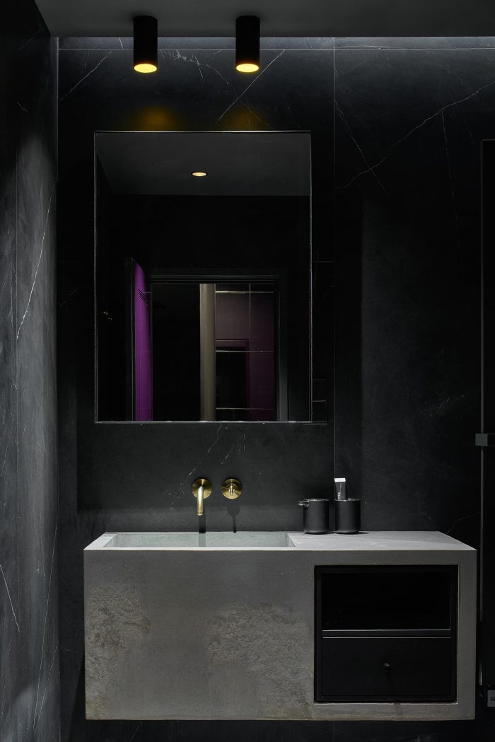 这间公寓被赋予了深灰色,几乎是黑色,所以房间的限制在阴影中消失了。明亮的饱和颜色的家具在空间中起到了强调作用。聚光灯突出了颜色和形状。光和影、饱和色和黑色之间的对比,共同创造了一种剧院般的感觉。