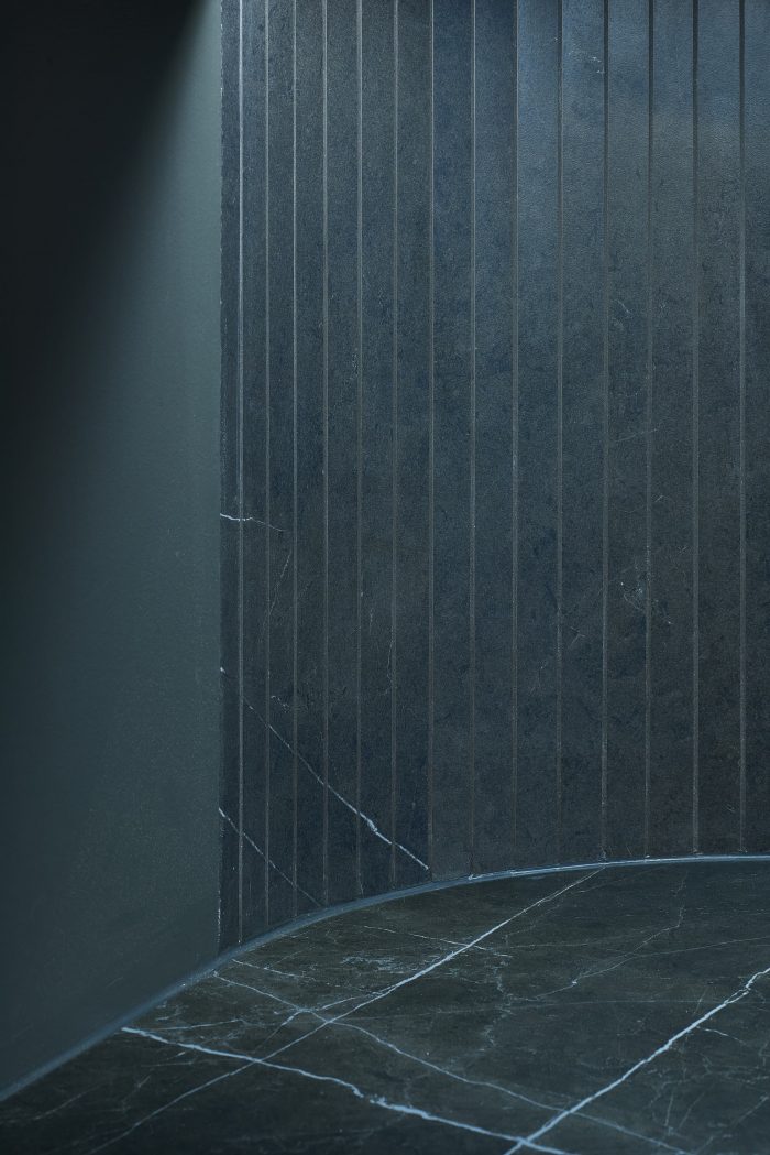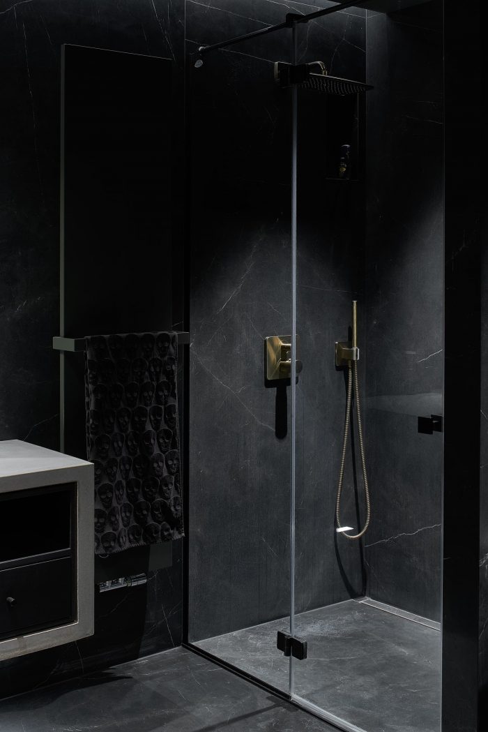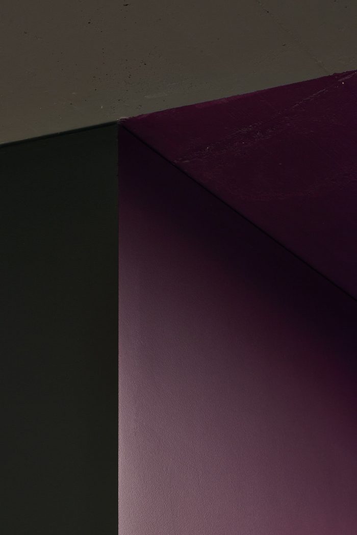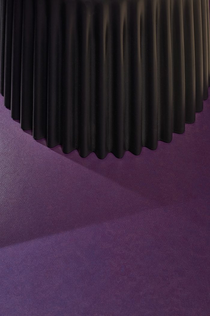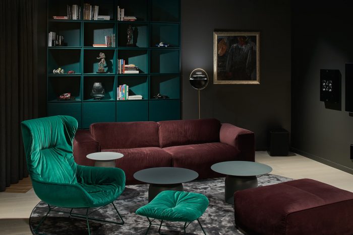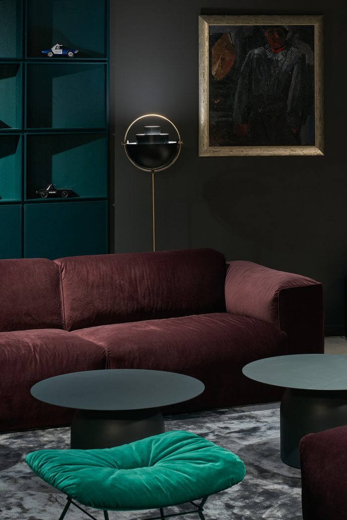 这间公寓被赋予了深灰色,几乎是黑色,所以房间的限制在阴影中消失了。明亮的饱和颜色的家具在空间中起到了强调作用。聚光灯突出了颜色和形状。光和影、饱和色和黑色之间的对比,共同创造了一种剧院般的感觉。