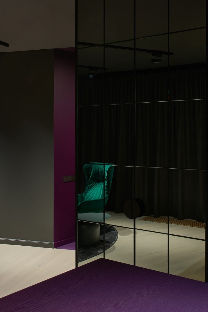 The apartment was given dark grey, almost black color, so the limits of the room dissolve in the shadows. Bright saturated colors of the furniture put accents in the space. The spotlights highlighting the colors and the shapes. The contrasts between light and shadow, saturated color and black all together create a theatre-like feeling.