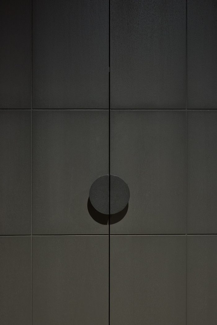 最初的公寓规划有一个烟囱,但客户不希望有壁炉。烟囱轴被延长,形成一个更大的体积,有助于塑造一个独立的入口区。这个中央体量容纳了镜子、书架、杂物柜和冰箱。将冰箱移出厨房的壁龛,使厨房的家具设计严格地以水平为导向,而没有任何垂直的家具,通常冰箱就在那里。