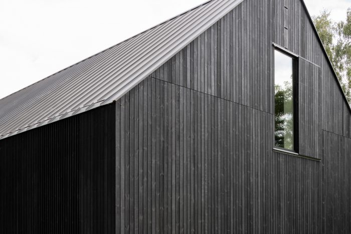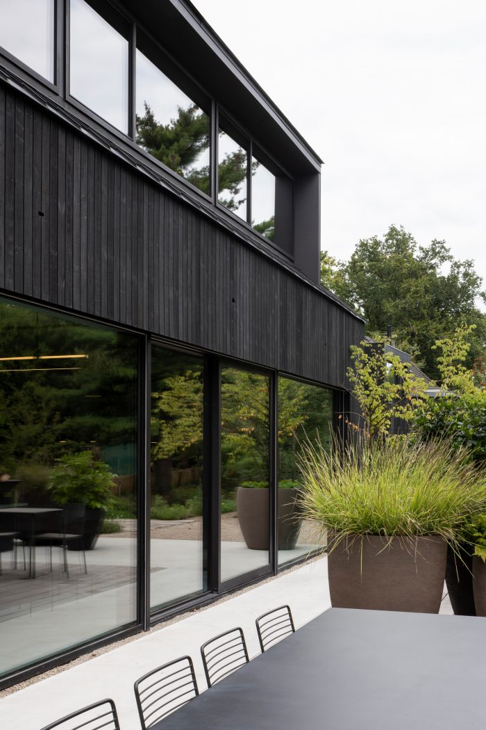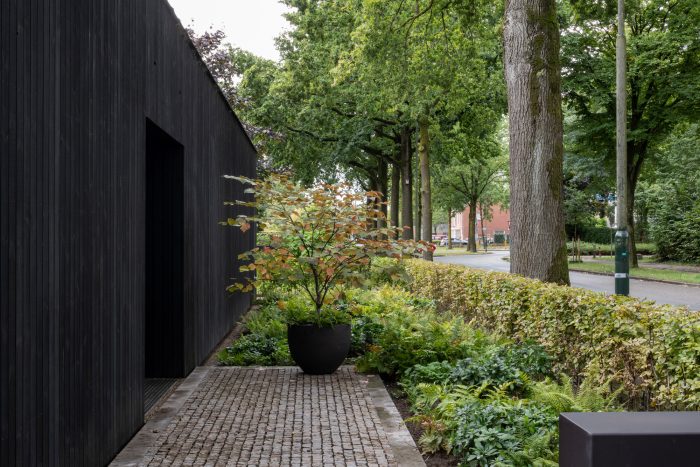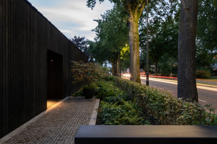 The Black Barn is designed as an abstract barn volume with black-stained wooden facades and a zinc roof. In a larger context, it stands on a historic ribbon development and has the shape of a barn, including a recessed building line, an integration that befits the site. The front presents itself as a modest, closed volume. However, the open-slatted structure creates a translucent effect at dusk. It thus gives extra layering and shows a glimpse of studio life from the outside.
