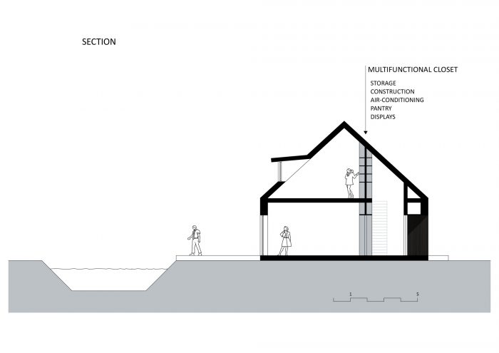 黑谷仓被设计成一个抽象的谷仓体量,有黑色染色的木质外墙和一个锌屋顶。在一个更大的背景下,它站在一个历史性的带状发展上,具有谷仓的形状,包括一个凹陷的建筑线,这是一个与场地相称的整合。正面呈现为一个适度的、封闭的体量。然而,开放的板状结构在黄昏时创造了一种半透明的效果。因此,它提供了额外的层次感,并从外部展示了工作室生活的一瞥。